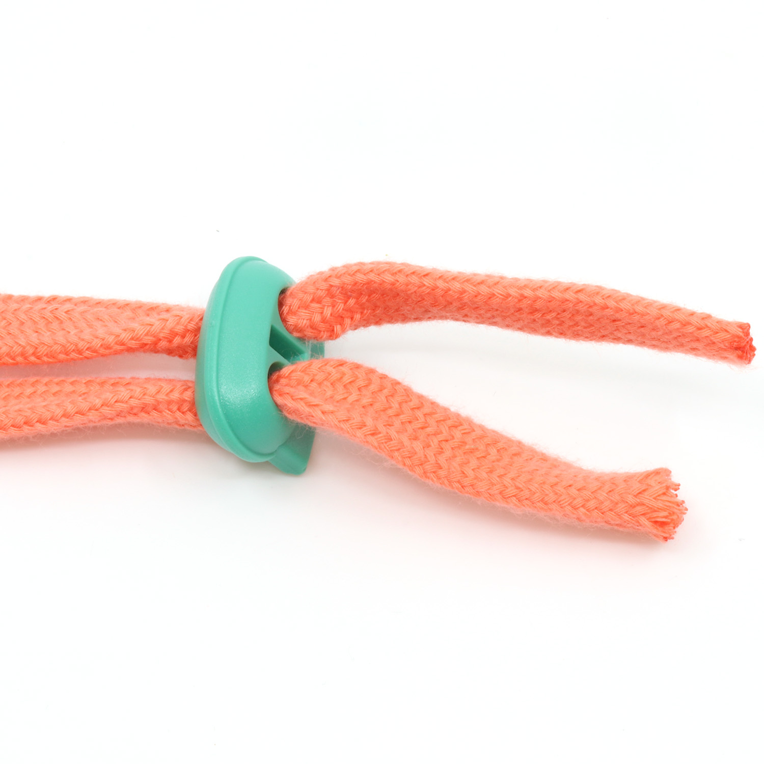 Les deux ouvertures permettent d'enfiler facilement les cordons et les rubans et de les ajuster individuellement. Si l'enfilage se révèle difficile, une petite astuce peut t'aider : il suffit d'enrouler un morceau de ruban adhésif autour de l'extrémité du cordon pour qu'il glisse sans effort à travers le stoppeur.