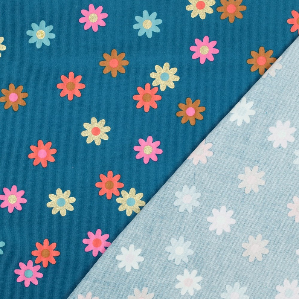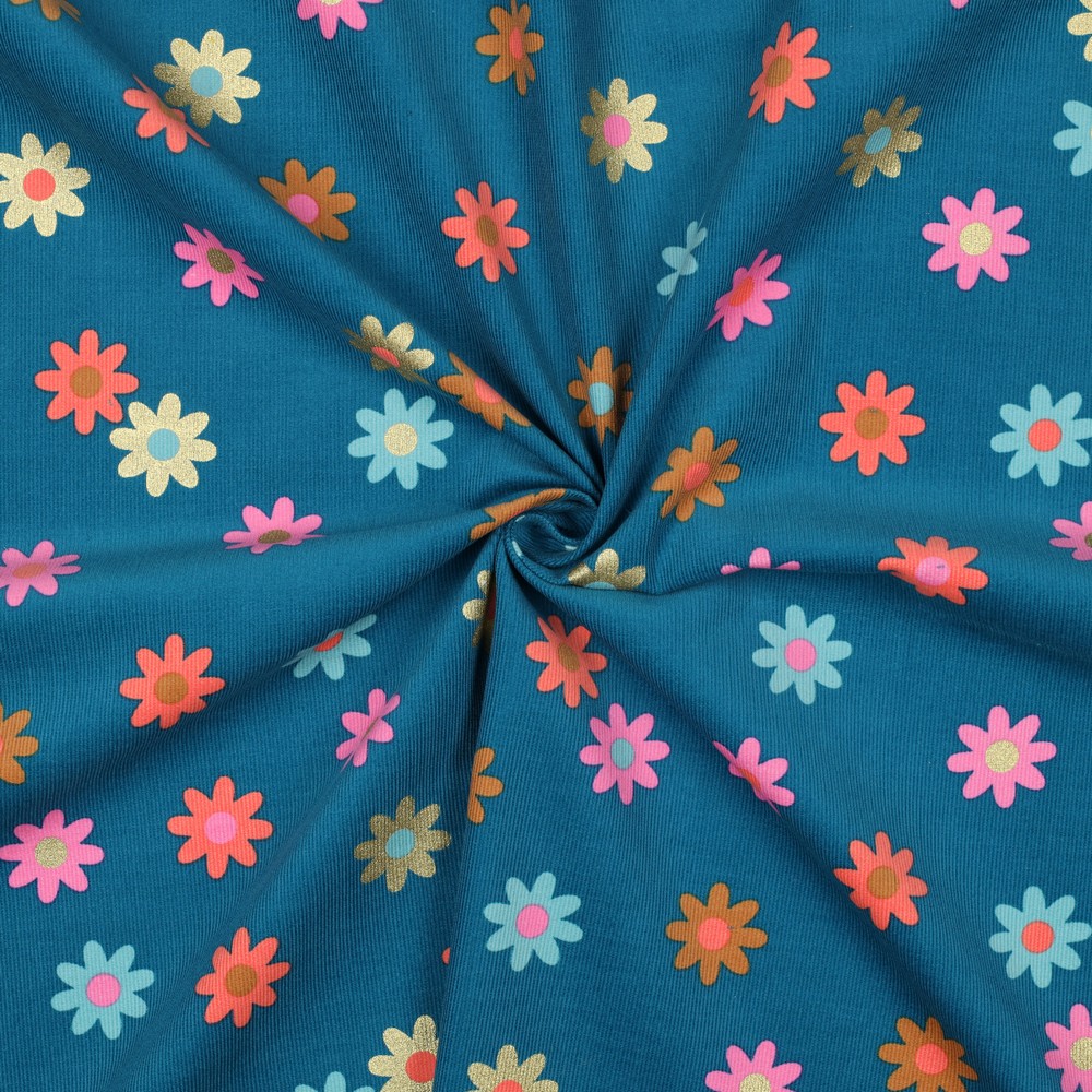 La combinaison harmonieuse des couleurs or et pétrole est parfaite pour les saisons plus fraîches, tout en restant fraîche et vivante grâce aux fleurs claires. Un tissu idéal pour tous ceux qui aiment les motifs floraux et souhaitent donner à leurs créations faites main un look élégant mais adapté aux enfants.