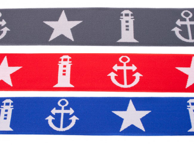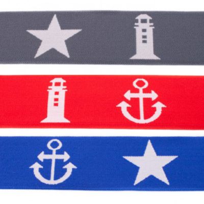 Cet élastique maritime apporte immédiatement un air de vacances à tes projets de couture ! En rouge vif, bleu et gris foncé classique, l'élastique apporte une touche de fraîcheur - décoré de motifs clairs et contrastés comme des phares, des ancres et des étoiles.