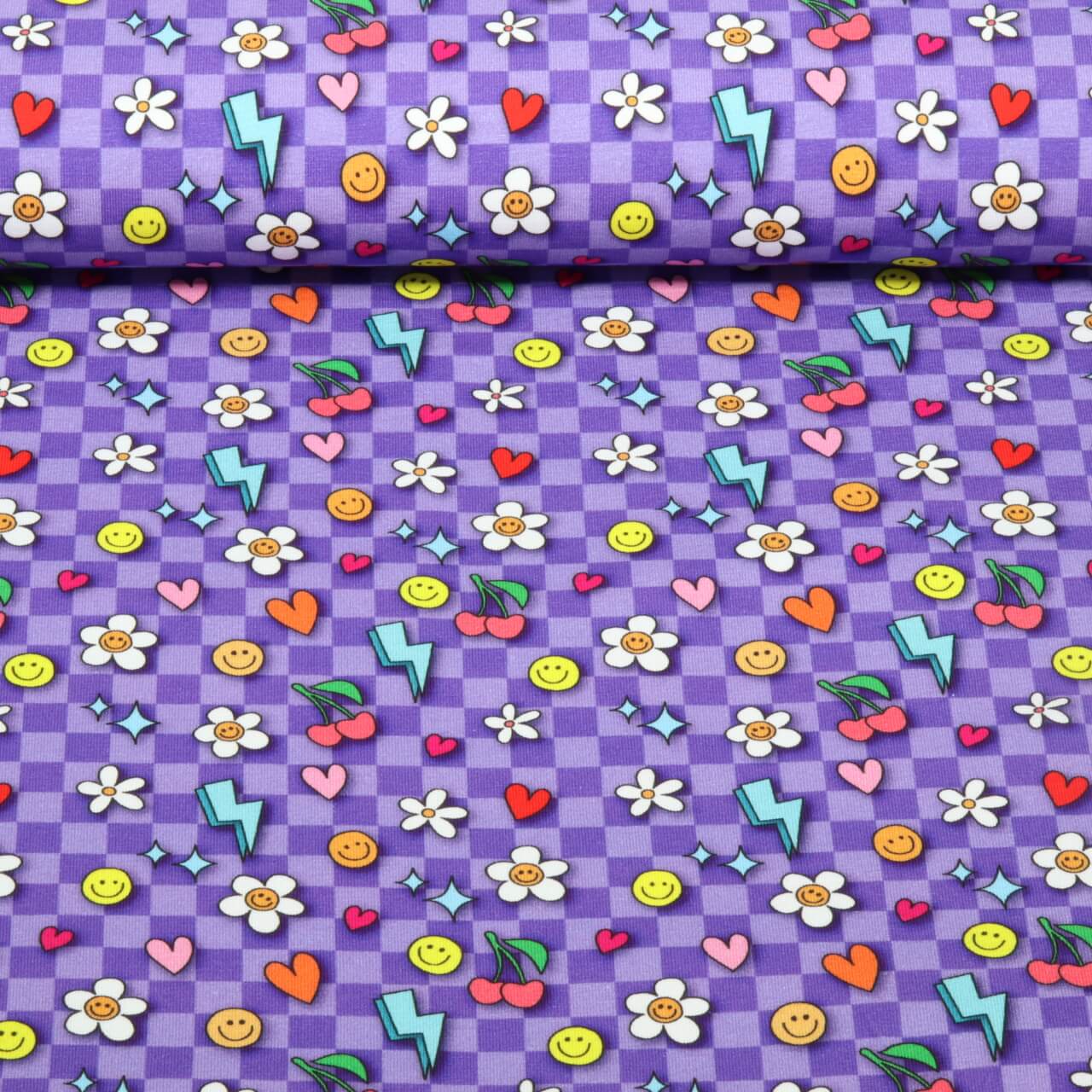 Un tissu comme un encouragement : sur un violet riche et profond dansent des smileys joyeux, des petits cœurs, des étoiles et des déclarations affectueuses comme "Choose Your Vibe" et "Be You". Des accents vifs en jaune, rose, turquoise et orange font briller les motifs ludiques et font de ce design un véritable highlight de bonne humeur.