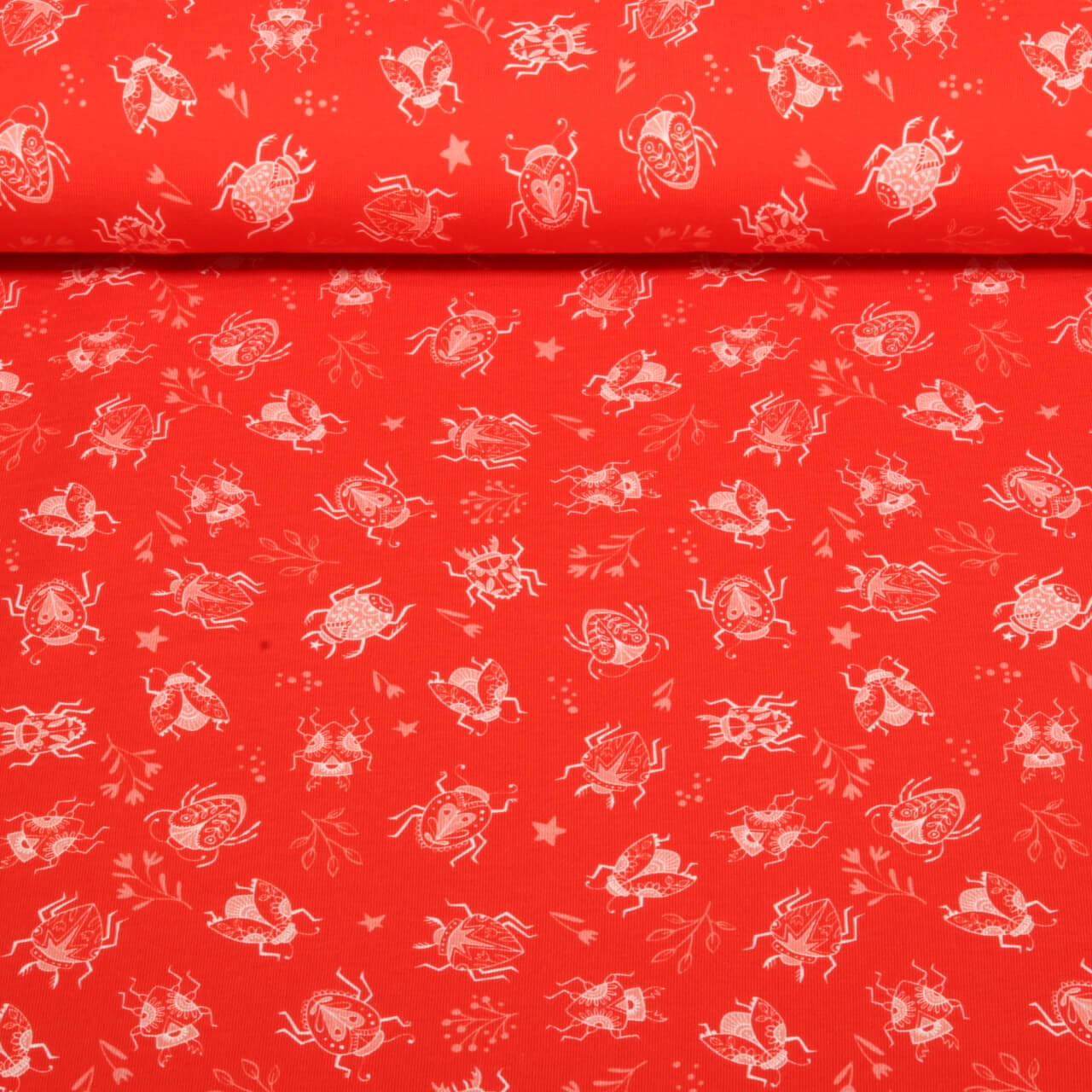 Un joyeux crapaud pour tes projets de couture : Sur le fond rouge vif s'ébattent des scarabées et des insectes aux couleurs fraîches, conçus avec amour. De délicates nuances de rose et de rose côtoient des accents d'orange, de jaune, de menthe et de bleu foncé - chaque petit animal rampant est illustré avec de nombreux détails et semble presque dessiné.
