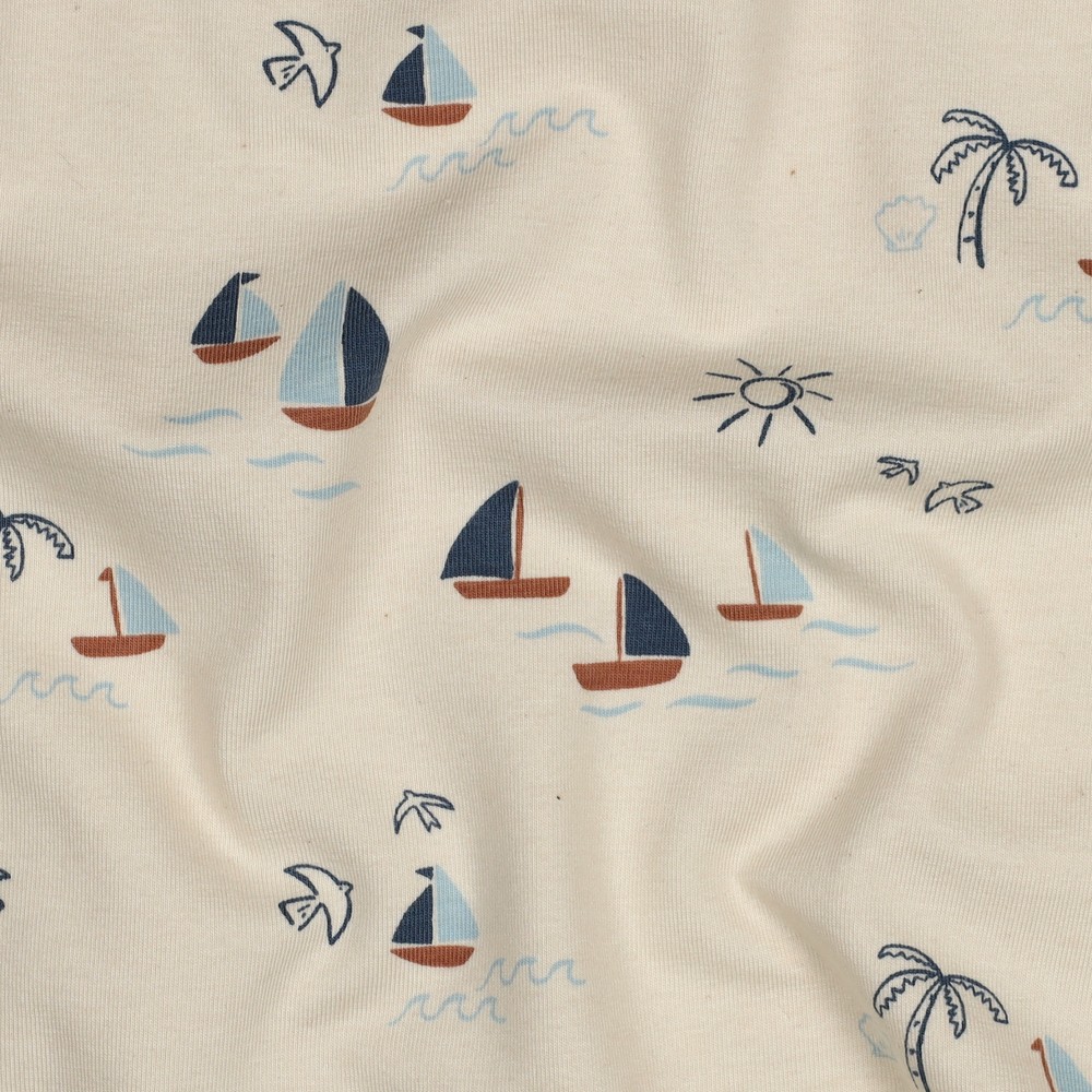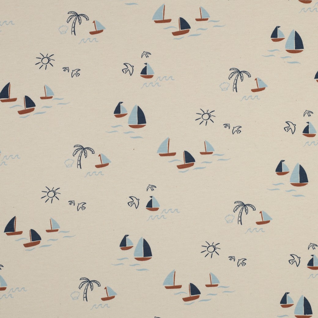 Démarre et mets le cap sur tes projets préférés ! Sur le doux ton naturel de ce jersey s'ébattent de petits voiliers joliment illustrés dans de douces nuances de bleu et de rouge. Des lignes ondulées discrètes et des détails fins confèrent au design une légèreté maritime sans être envahissante - idéal pour tous ceux qui aiment le look côtier.