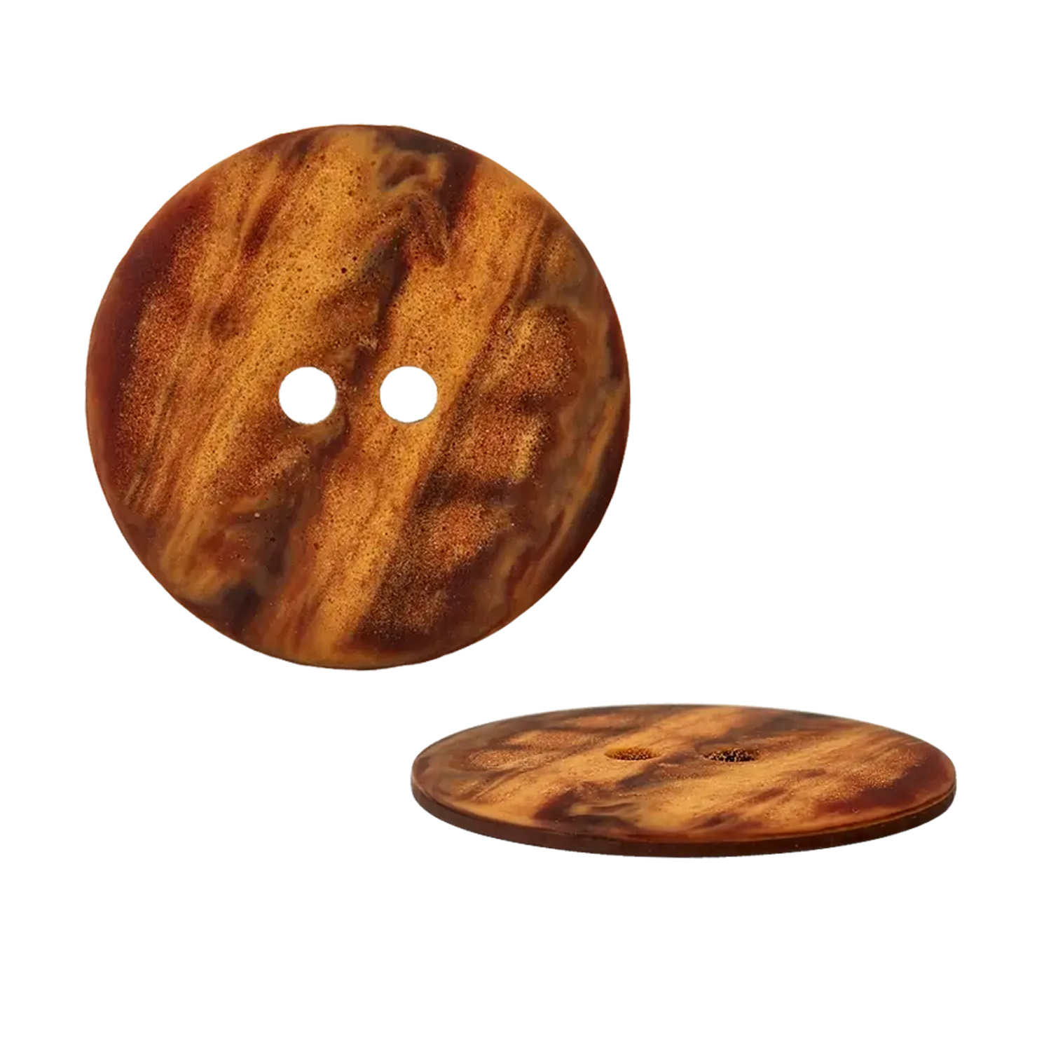Ce bouton marbré à 2 trous apporte des accents chaleureux et naturels à tes projets de couture. Les veines vives dans des tons riches de marron et d'or rappellent le bois noble ou l'ambre et font de chaque bouton une petite pièce unique.