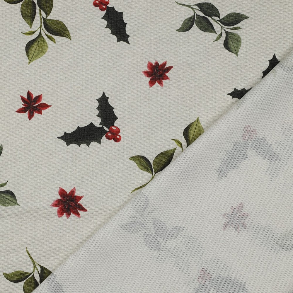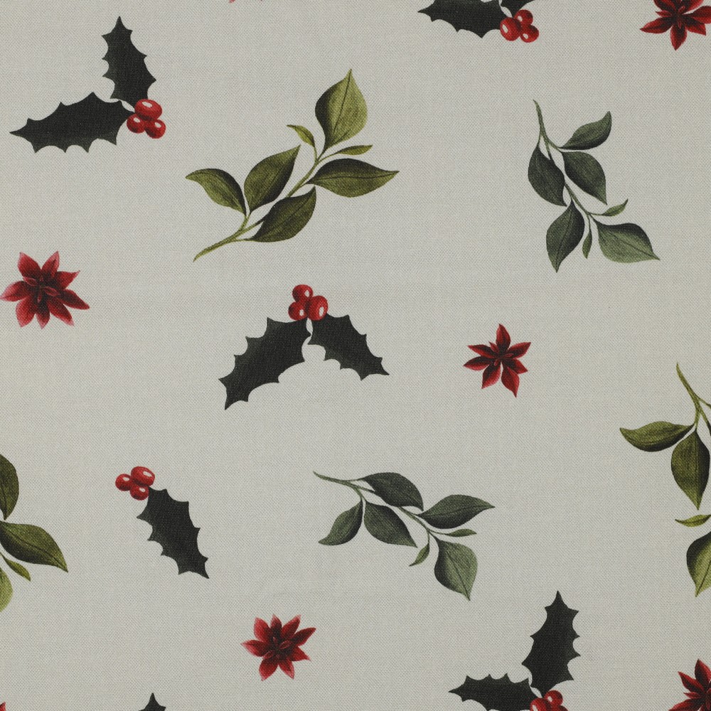 La haute qualité de l'impression numérique met en valeur chaque aiguille, chaque feuille et chaque baie avec une netteté exceptionnelle – comme si vous regardiez un bouquet de Noël fraîchement décoré. Le jeu harmonieux de verts, rouges, bruns et touches de couleurs discrètes fait de ce tissu le compagnon idéal pour la période de l'Avent et de Noël.
