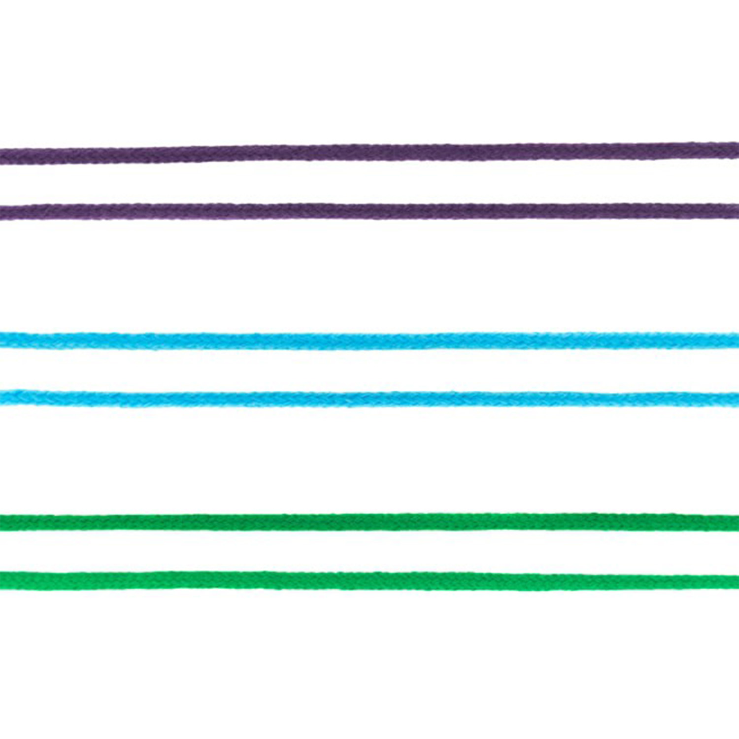 .Ce cordon fin et agréablement doux d'environ 3mm de diamètre apporte des accents de couleurs fraîches aux projets de couture. Sur l'image, on peut voir des tons lumineux allant du violet vif au vert riche en passant par le turquoise intense et le bleu ciel éclatant - idéal pour créer des accents colorés ou pour compléter des détails parfaitement assortis.