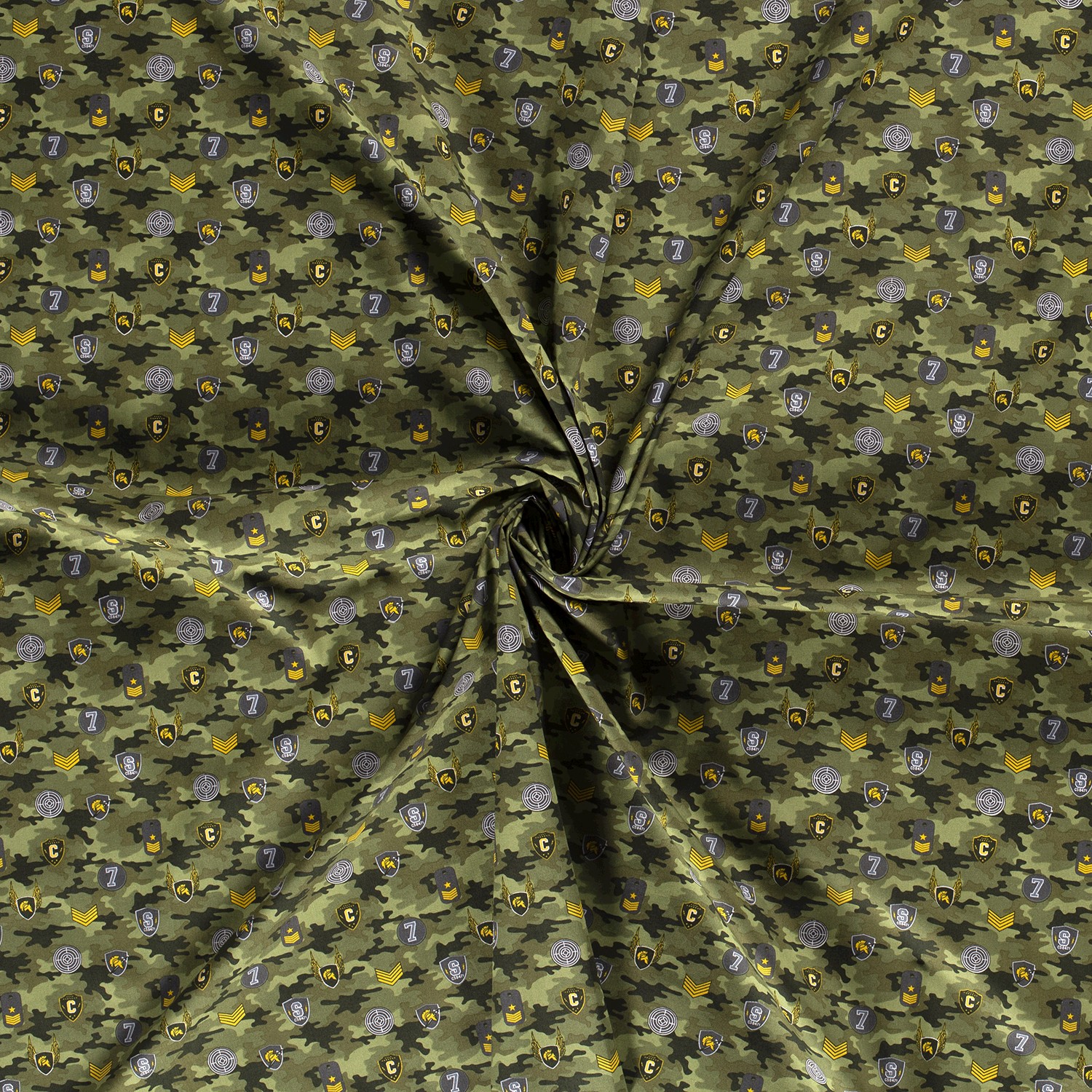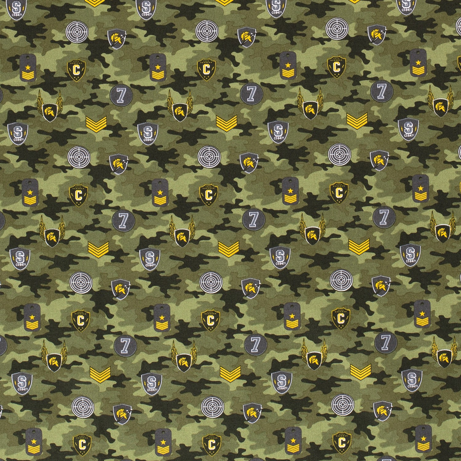Ce tissu en coton apporte un esprit d'aventure directement à votre table de couture : le motif camouflage classique dans différentes nuances de vert est habilement complété par des insignes et emblèmes de pilote détaillés. Aigles, ailes, étoiles et blasons en tons beige, marron et olive apportent des accents décoratifs et confèrent au design un look militaire et aviateur très tendance.