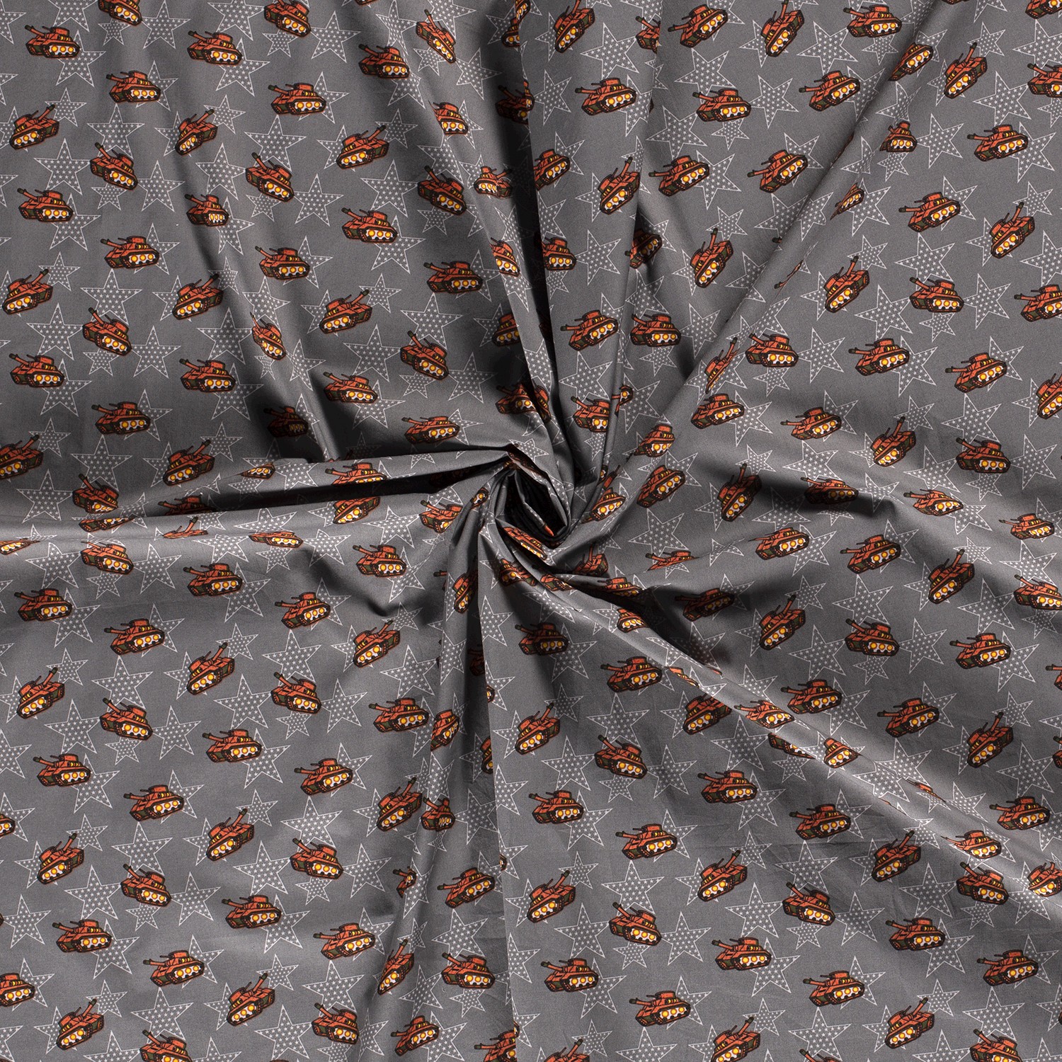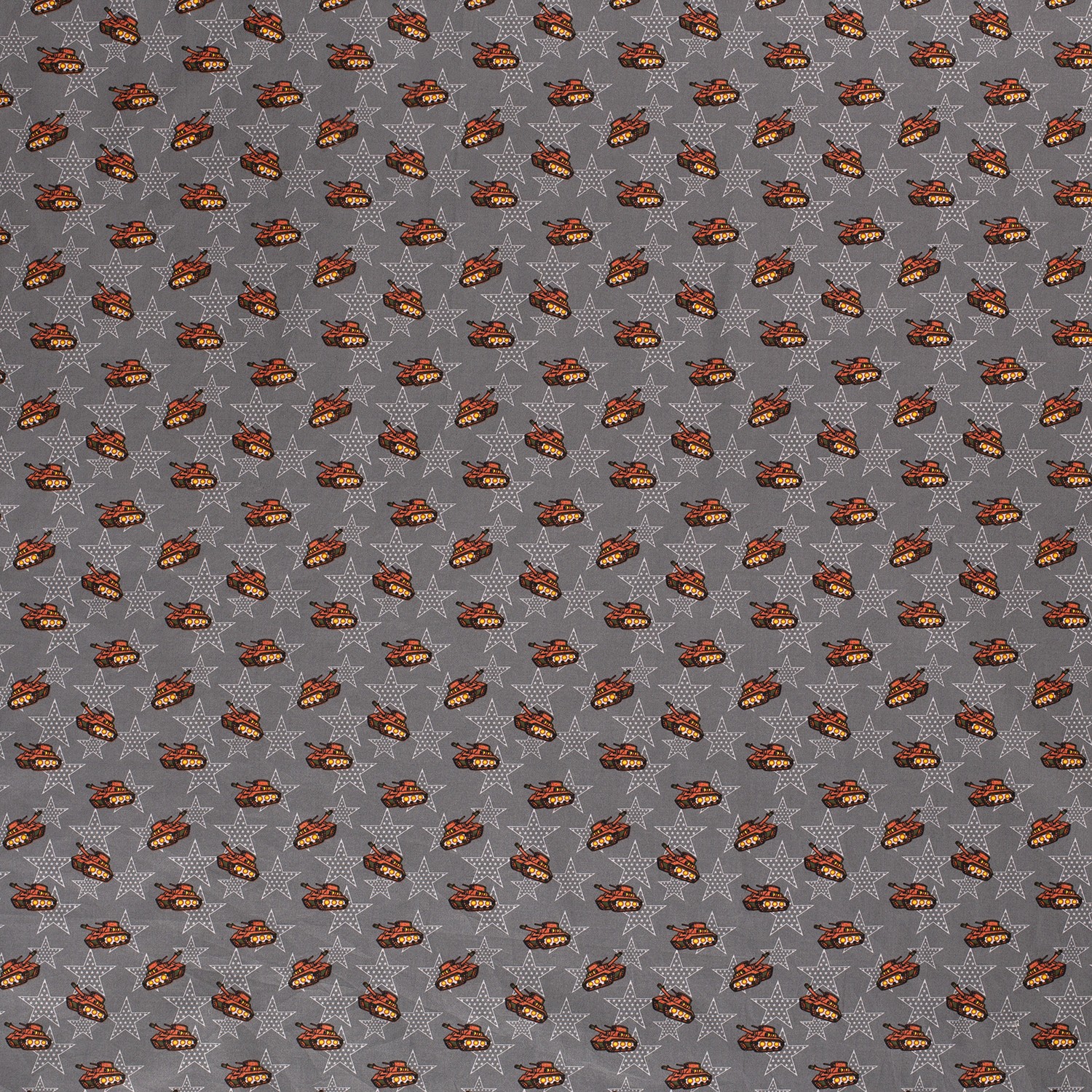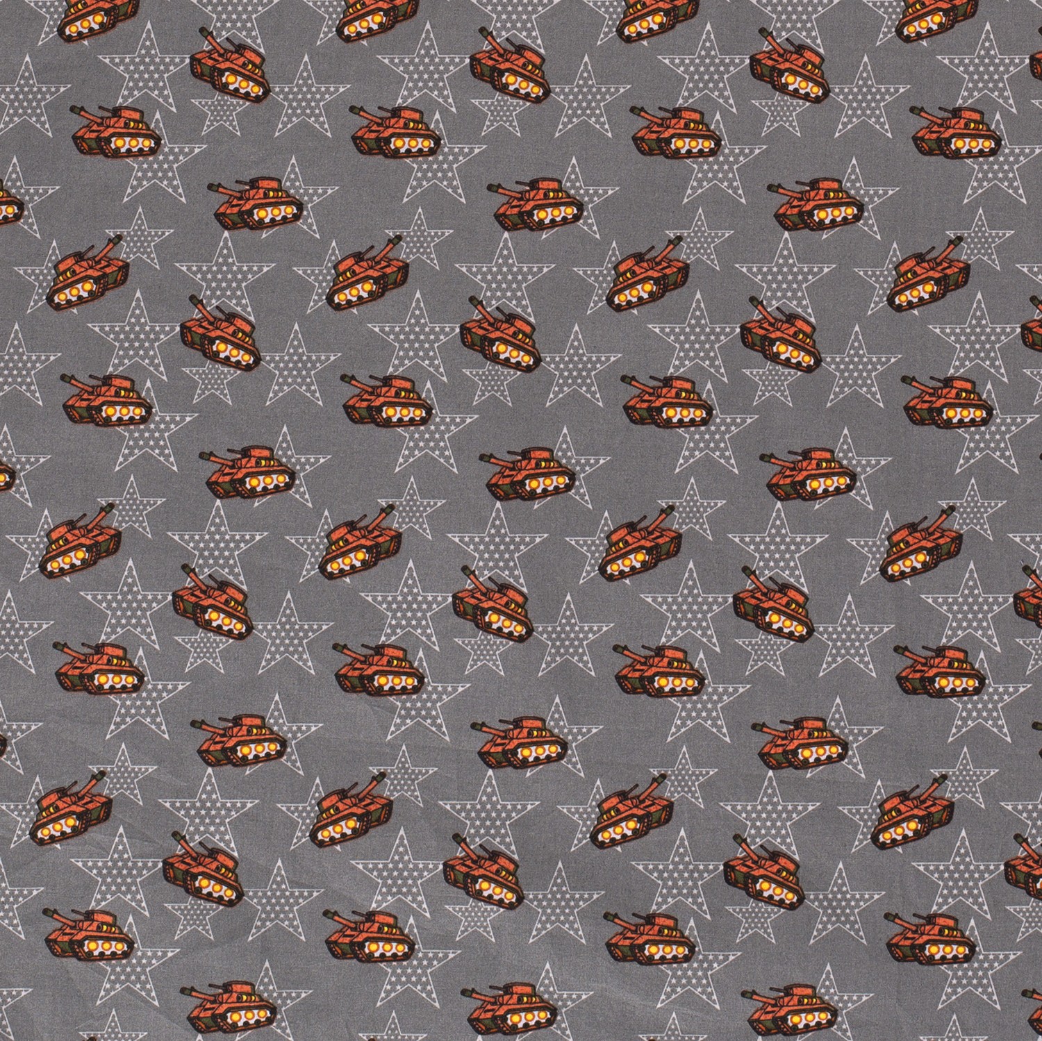 Sur ce tissu en coton exceptionnel, des motifs de chars stylés rencontrent de petites étoiles réparties uniformément – le tout sur un élégant fond gris foncé. Les chars finement dessinés paraissent modernes et puissants, tandis que les étoiles claires apportent une touche ludique et légèrement militaire au design.