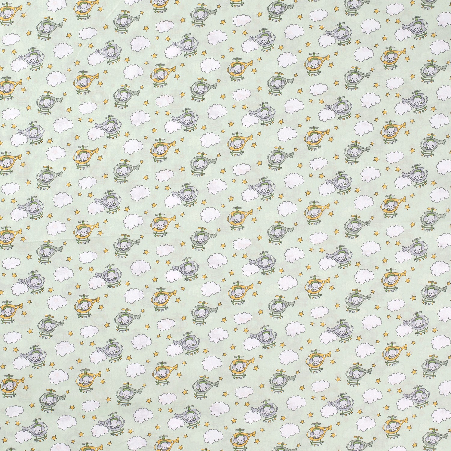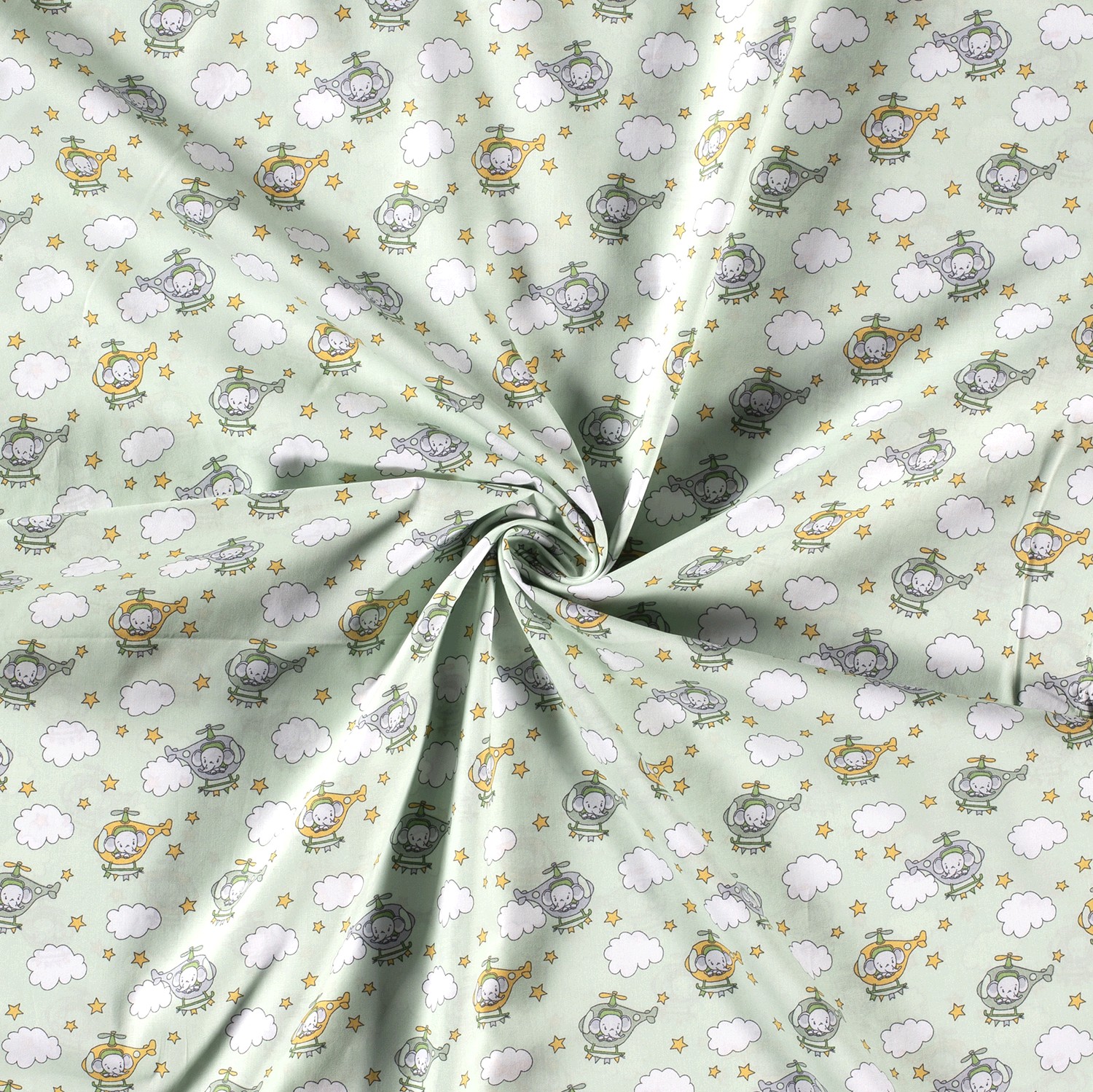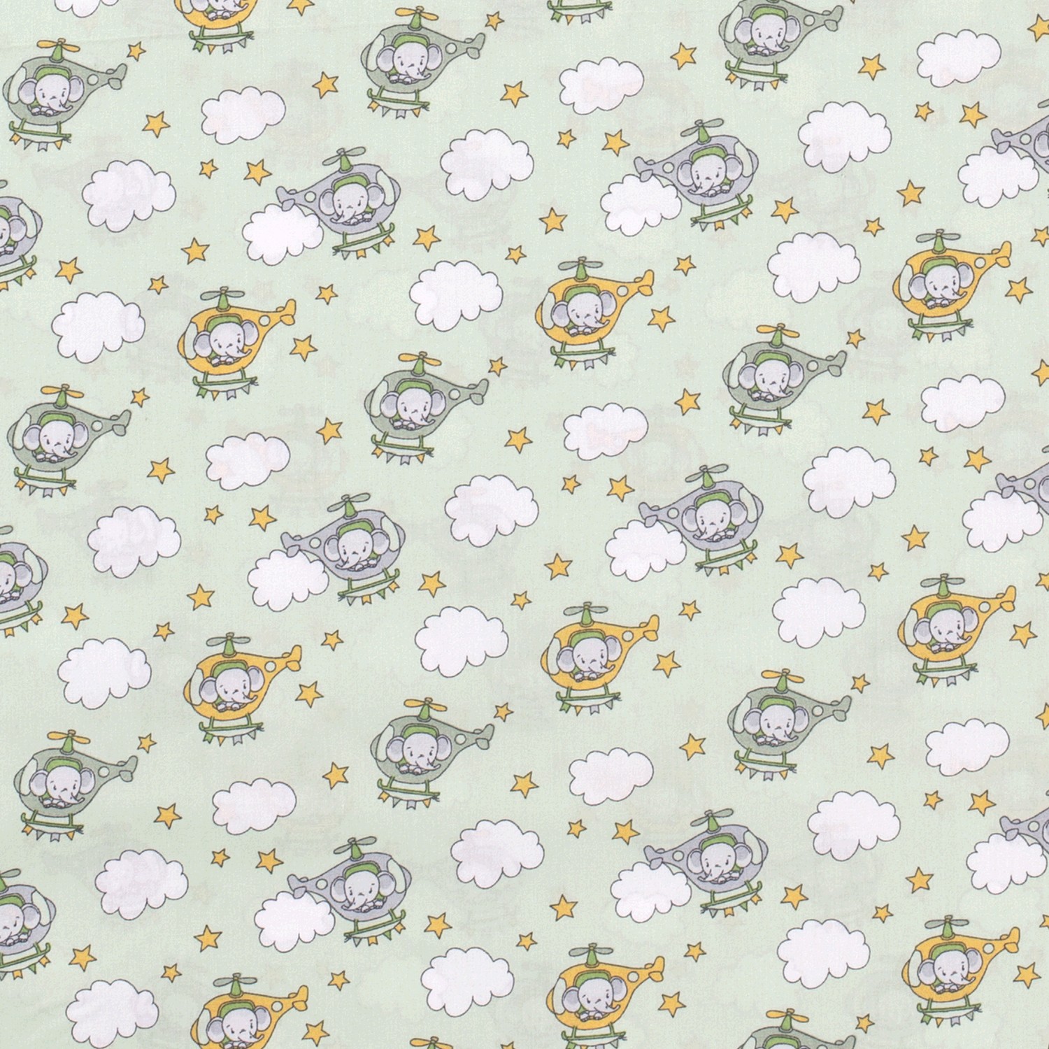 Envolez-vous et rêvez : Sur un fond doux couleur menthe claire, un petit éléphant vole joyeusement en hélicoptère à travers un ciel délicat d'étoiles et de petits nuages. Les motifs soigneusement conçus dans des couleurs douces et harmonieuses rendent ce tissu absolument charmant pour petits et grands.