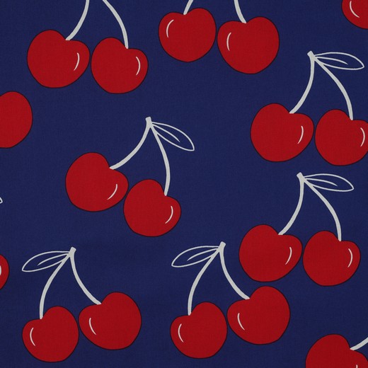 Des cerises juteuses sur un fond bleu royal – ce tissu enduit est un véritable accroche-regard. Des cerises rouge vif avec des tiges et des contours blancs stylisés dansent en grand format sur le tissu et créent un look rétro joyeux qui met immédiatement de bonne humeur.