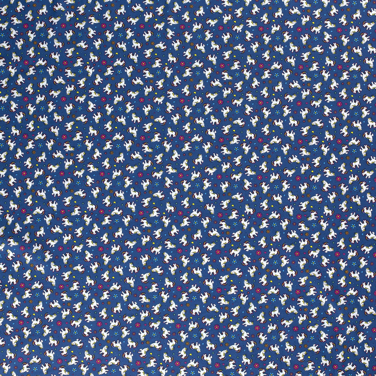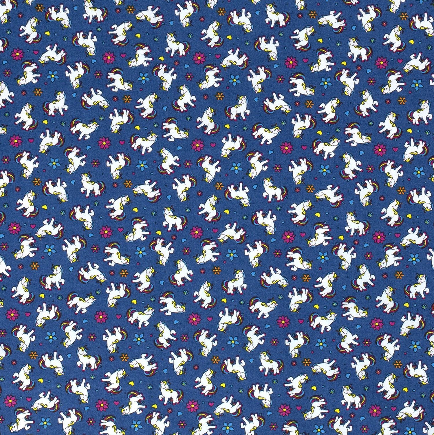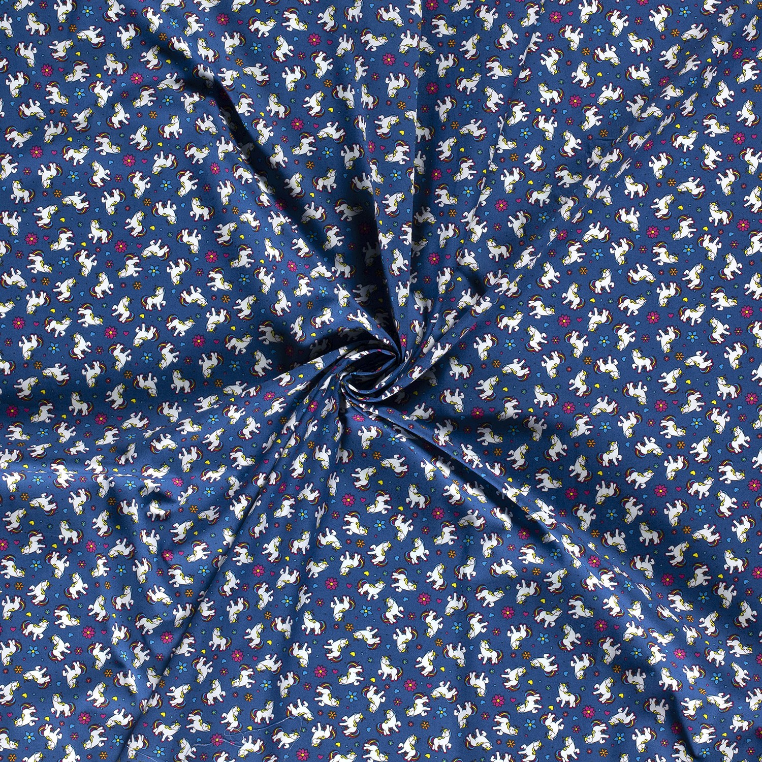 Ce tissu en coton enchanteur vous transporte dans un monde coloré de licornes : Sur un fond bleu éclatant, des licornes arc-en-ciel joyeuses galopent, entourées de petits cœurs et de délicates fleurs. Les motifs soigneusement conçus et les détails aux couleurs fraîches et vives font de ce tissu un véritable coup d'œil – parfait pour tous ceux qui aiment la magie des arcs-en-ciel et les licornes.