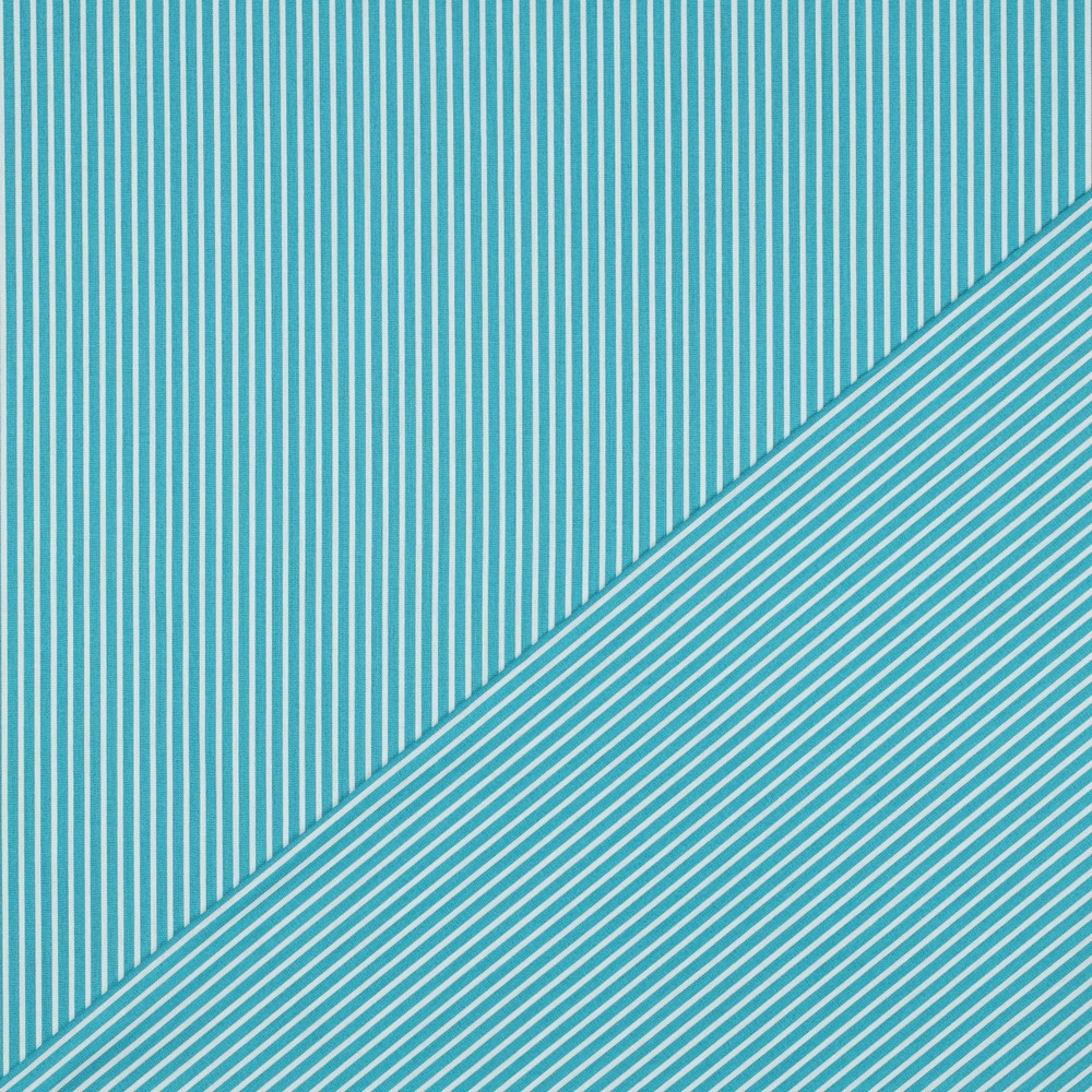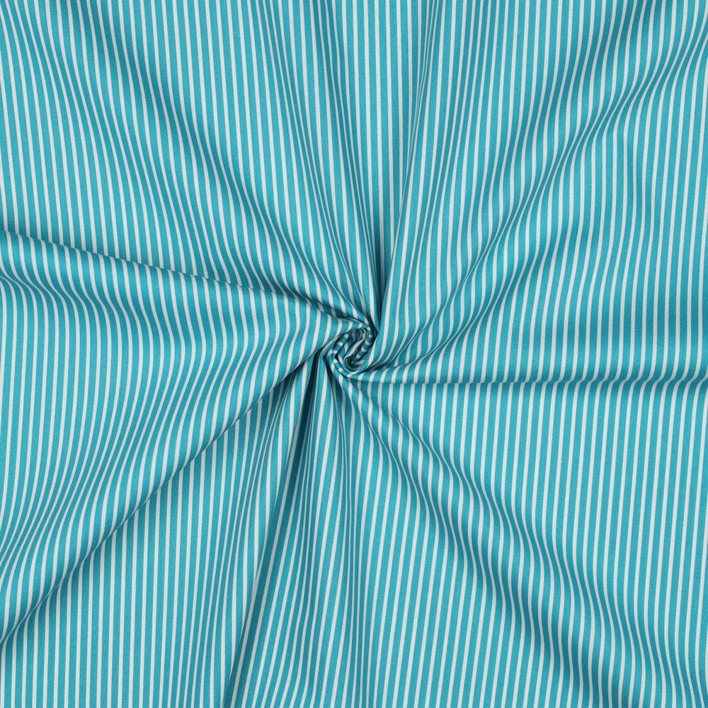 Un délicat jeu de rayures en bleu pétrole clair : Ce tissu séduit par ses fines rayures régulières qui lui confèrent une note moderne tout en restant intemporellement élégant. Les lignes discrètes apportent fraîcheur et légèreté et se marient parfaitement avec des tissus unis et d'autres motifs.