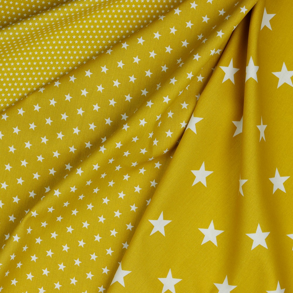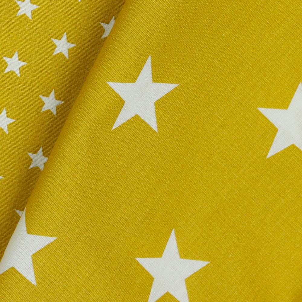 Une teinte chaude moutarde rencontre un design graphique clair d’étoiles : ce tissu est un véritable accroche-regard pour tous ceux qui aiment les looks modernes mais aussi confortables. Les grandes étoiles blanches, réparties uniformément, se détachent vivement sur le fond profond et apportent une touche joyeuse et intemporelle à vos projets de couture.