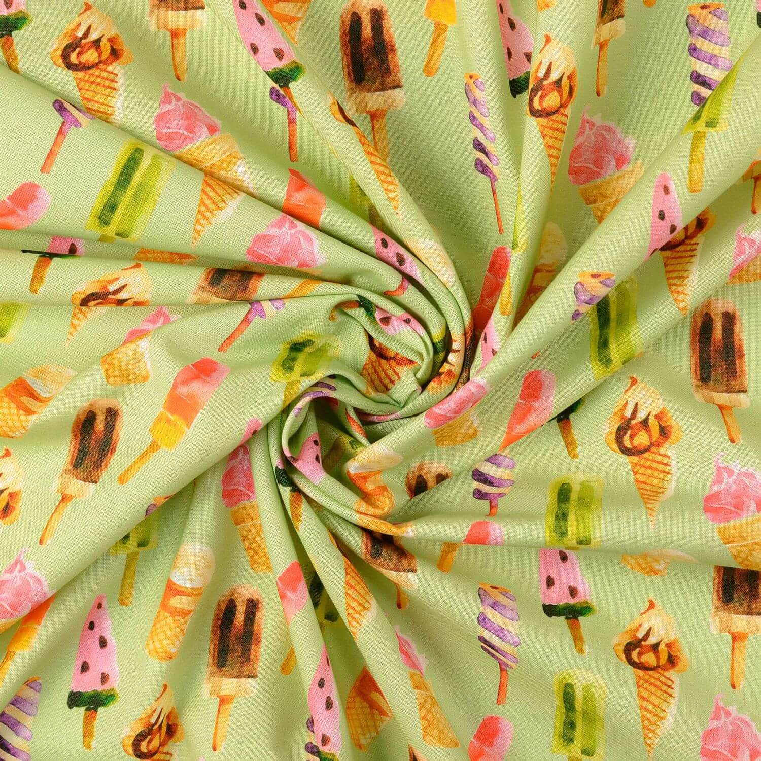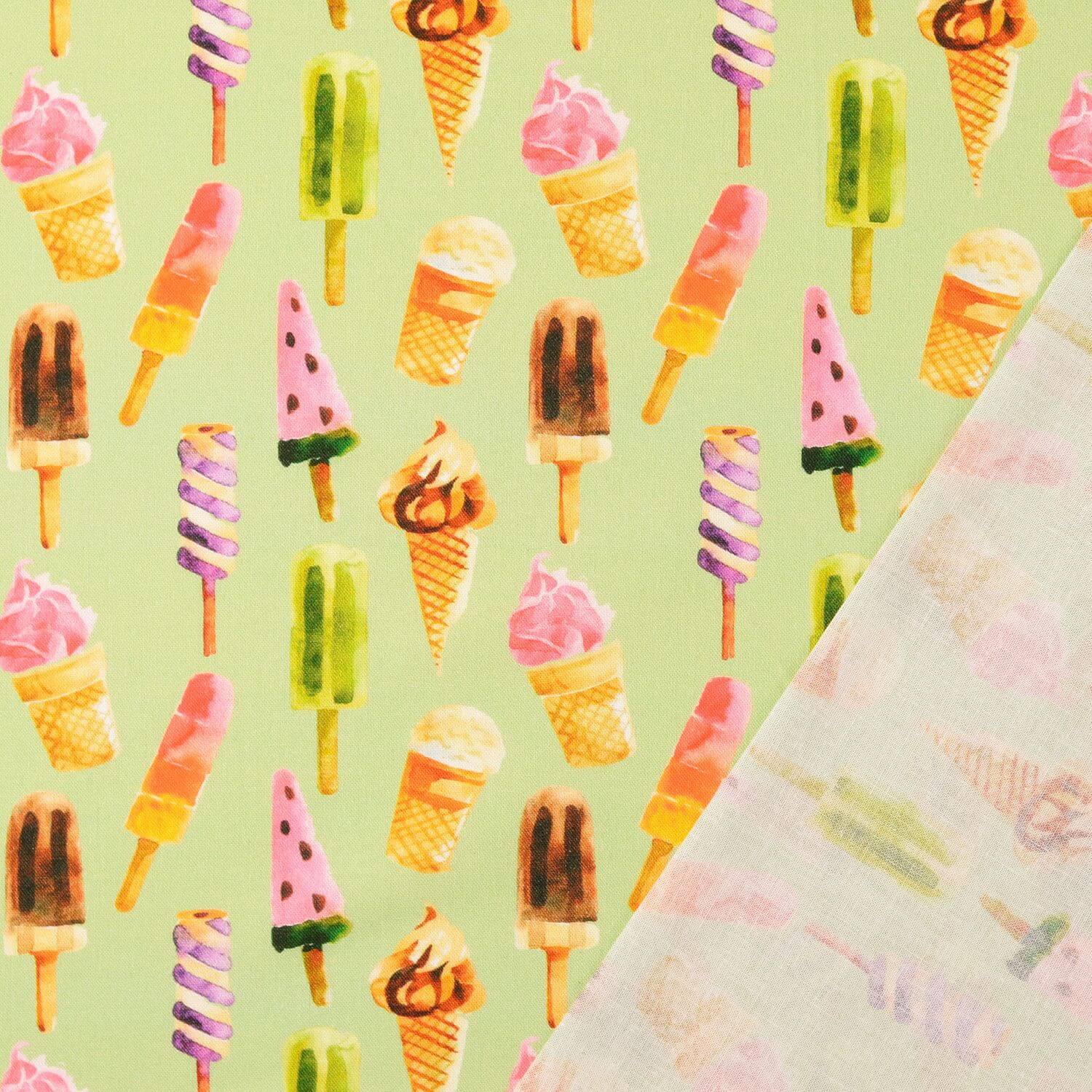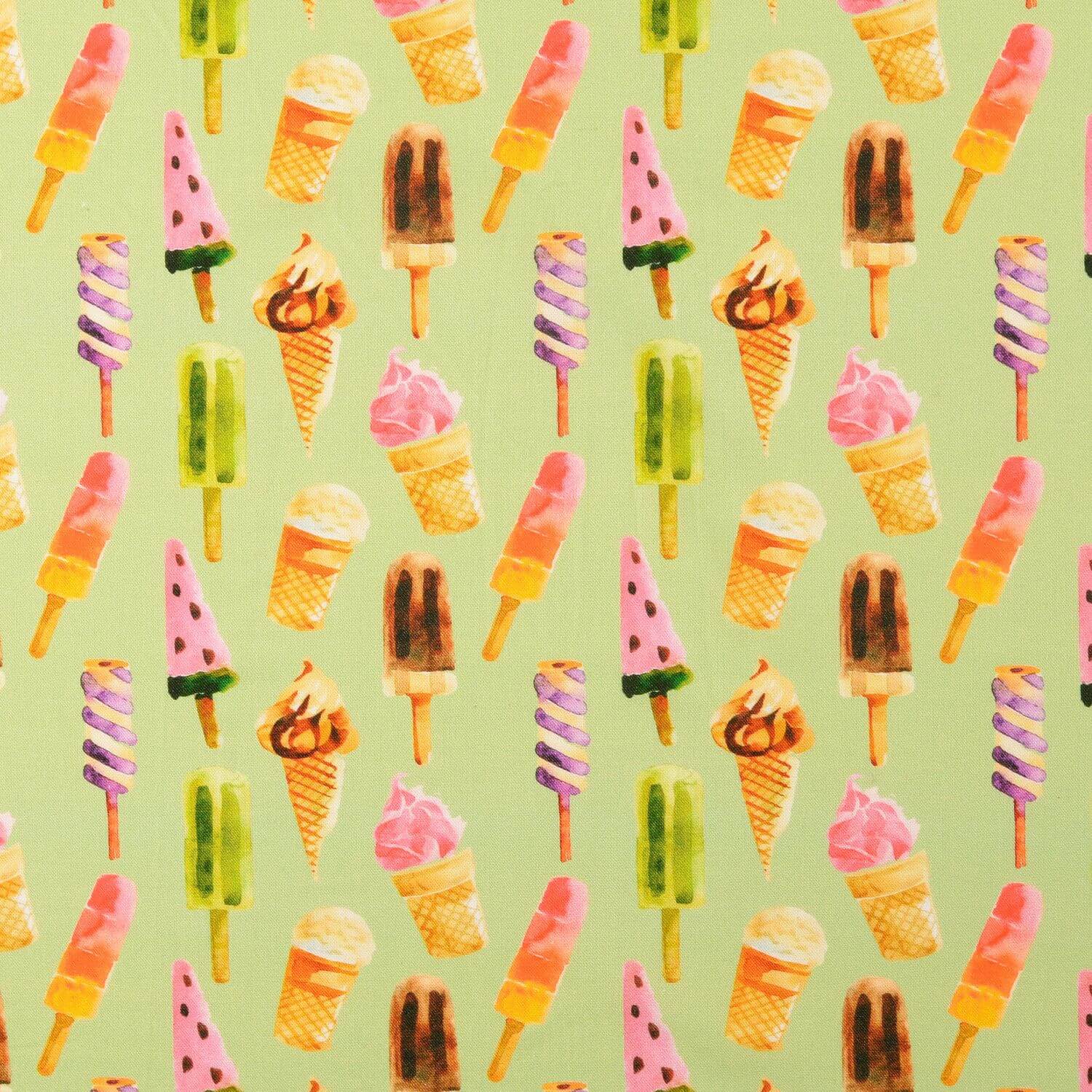 Un pur sentiment d'été : sur un Vert frais et riche s'ébattent des motifs de bâtonnets de glace multicolores, dessinés avec amour et imprimés numériquement. Le rose tendre, le jaune ensoleillé, le vert menthe frais et d'autres tons pastel rendent le design joyeux et vivant - comme un stand de glaces multicolores par une chaude journée d'été.
