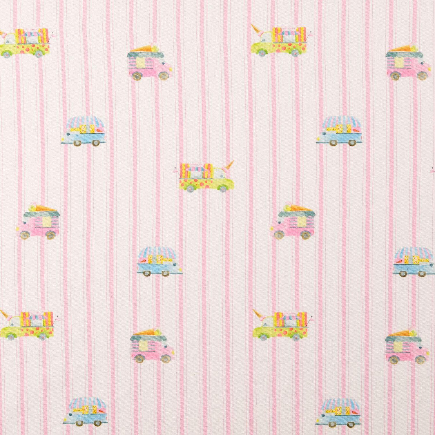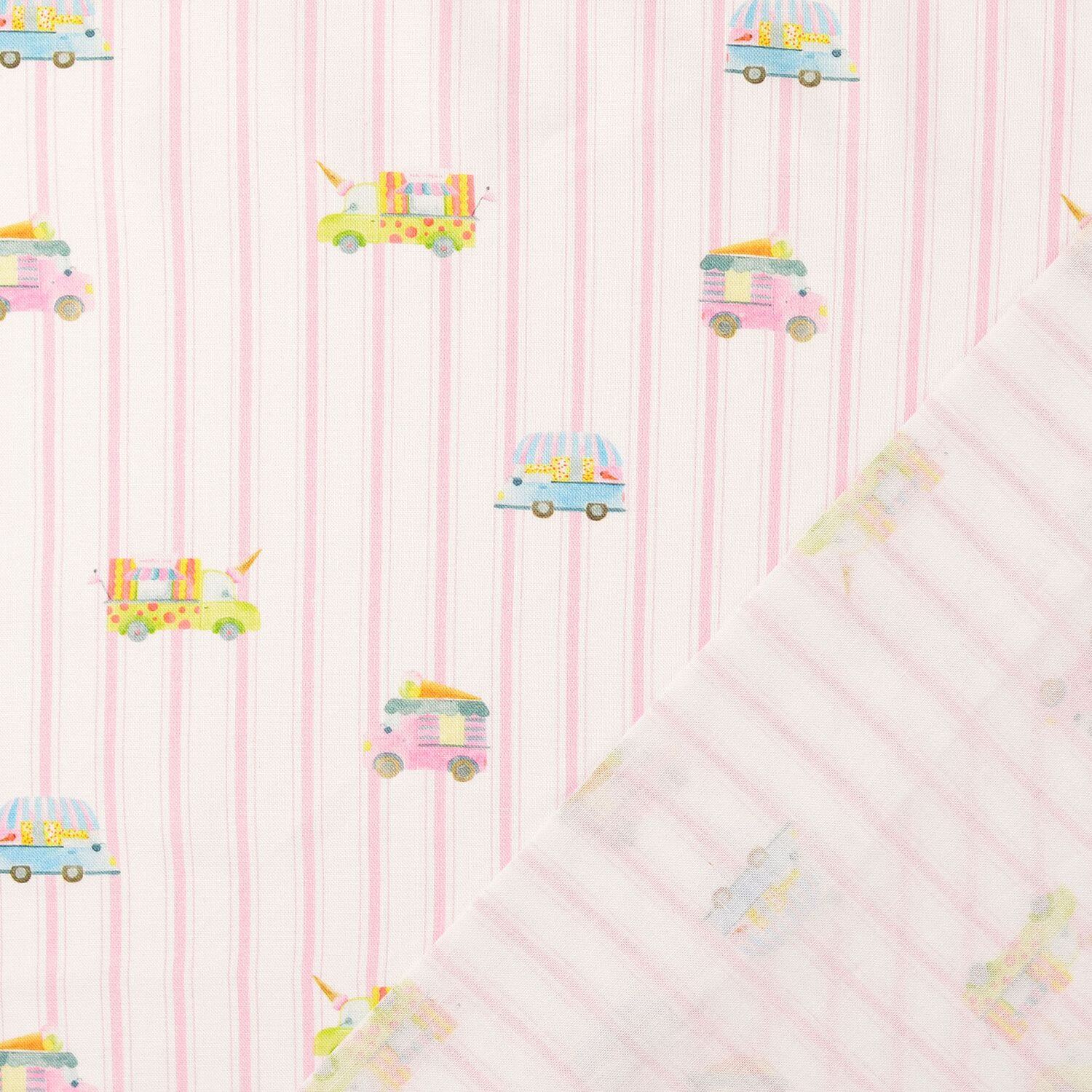Doux comme un jour à la mer : sur un fond délicatement rayé de blanc et de rose, de petits chariots de glace joliment illustrés roulent à travers le motif. Les détails fins comme les cornets de glace, les inscriptions et les éléments de décoration donnent au tissu un aspect vivant et répandent immédiatement l'ambiance estivale.