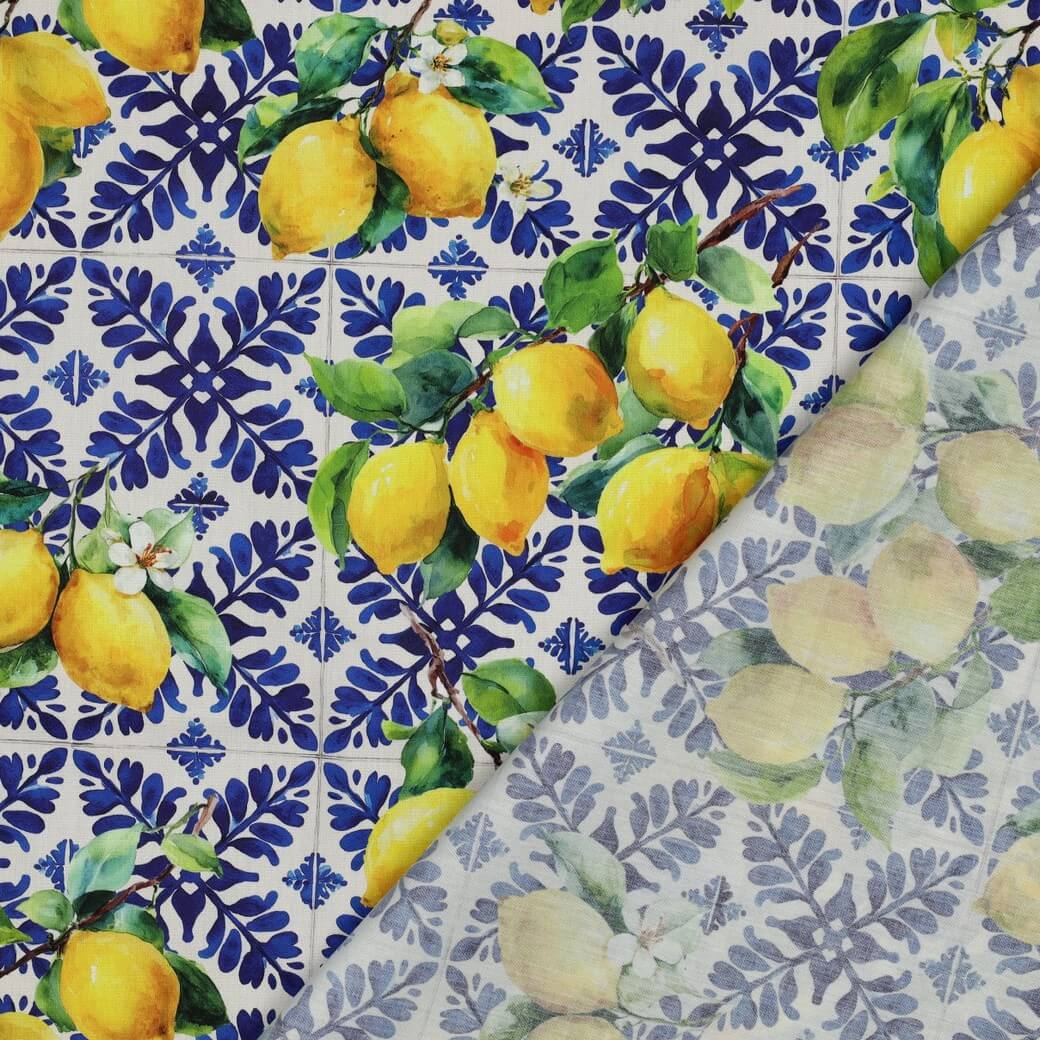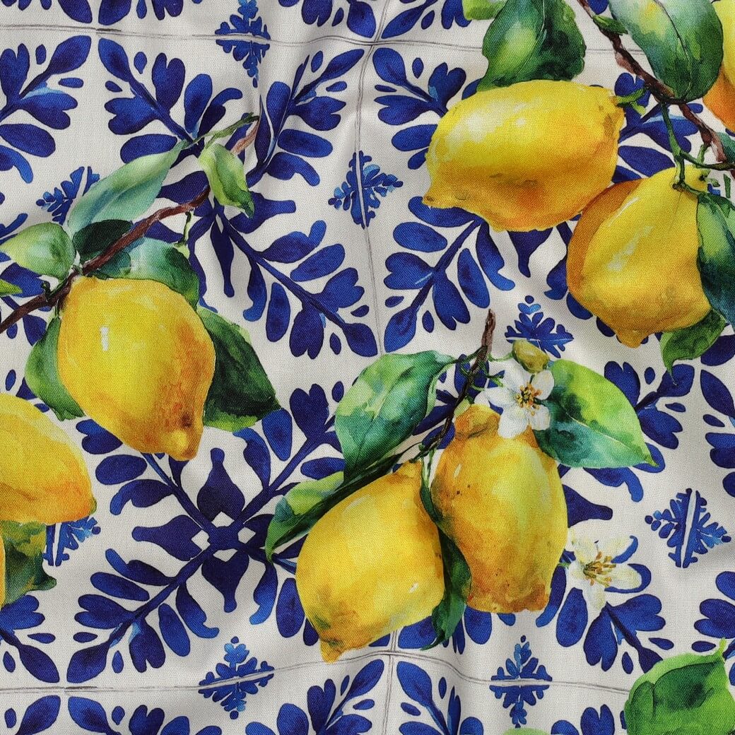 Ce tissu léger met du soleil dans ta garde-robe : des citrons jaunes vifs avec des feuilles vertes délicates brillent sur un fond bleu profond et rappellent une journée d'été au bord de la Méditerranée. L'impression digitale de haute qualité fait briller les couleurs de manière claire et brillante et ajoute une touche moderne et fraîche au design.