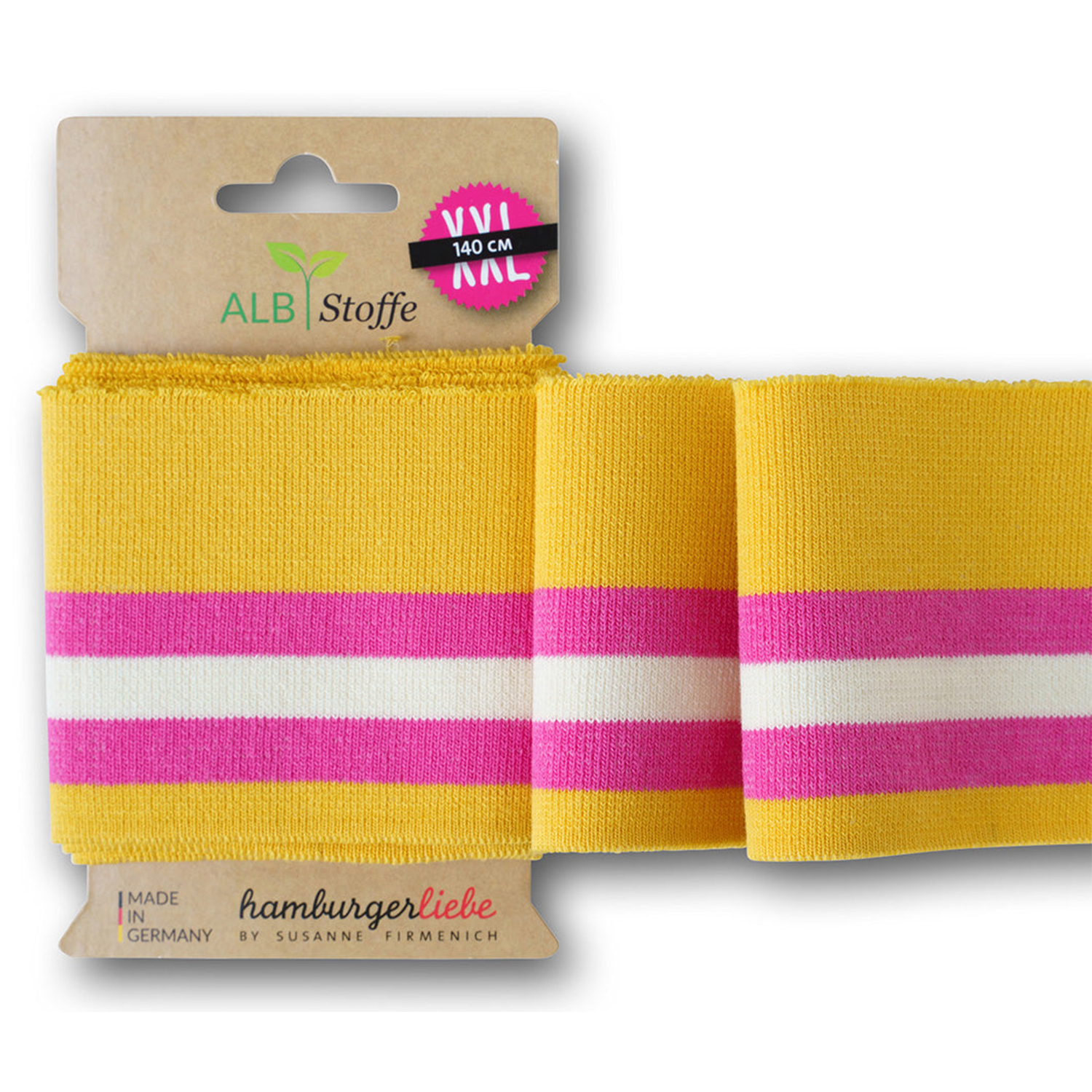 Avec Cuff Me College, tu apportes le véritable "look collège" à tes projets de couture. Les poignets jacquard sportifs se présentent dans des couleurs fraîches et claires et des motifs à rayures typiques : du bleu marine classique avec du blanc, en passant par le bleu royal vif, le jaune moutarde chaud et les tons rouille, jusqu'au turquoise moderne, au rose et aux pastels délicats, il y en a pour tous les styles. Les rayures contrastées apportent une touche cool et dynamique - parfait pour les tenues sportives ou les vêtements préférés qui aiment les détails.