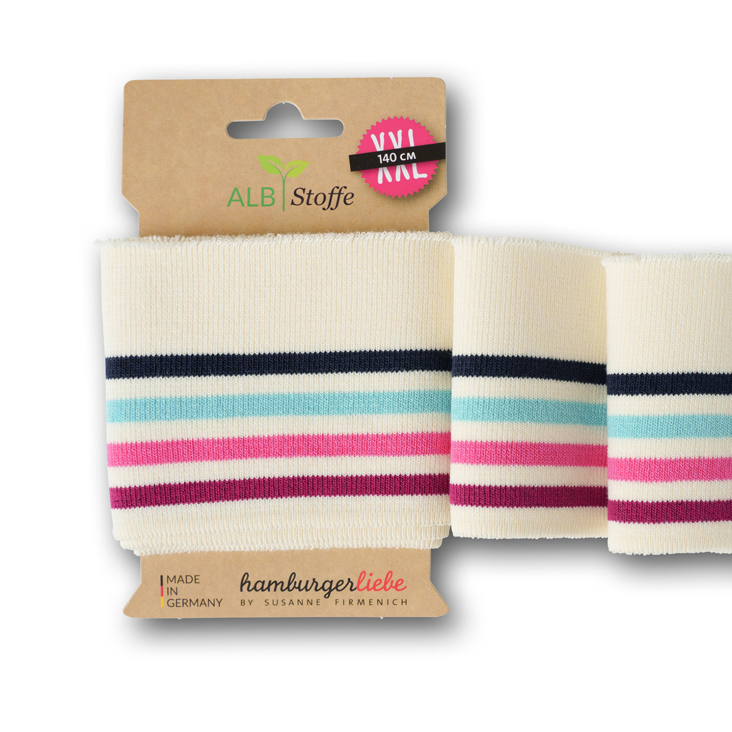 Avec Cuff Me College, tu apportes le véritable "look collège" à tes projets de couture. Les poignets jacquard sportifs se présentent dans des couleurs fraîches et claires et des motifs à rayures typiques : du bleu marine classique avec du blanc, en passant par le bleu royal vif, le jaune moutarde chaud et les tons rouille, jusqu'au turquoise moderne, au rose et aux pastels délicats, il y en a pour tous les styles. Les rayures contrastées apportent une touche cool et dynamique - parfait pour les tenues sportives ou les vêtements préférés qui aiment les détails. Les poignets sont déjà coupés, ont un bord bien travaillé et se travaillent en un tour de main - il suffit de les raccourcir à la longueur souhaitée, de les coudre et c'est fini. Idéal pour les manches, les ourlets, les bordures de pantalons, les cols ou les bonnets - partout où tu veux une finition professionnelle et stylée. Que ce soit pour des T-shirts, des sweat-shirts, des vestes, des vêtements pour enfants ou des accessoires, Cuff Me College donne en un clin d'œil à tes projets de couture un look moderne et de haute qualité - comme si tu les avais achetés, mais en beaucoup plus personnel.
