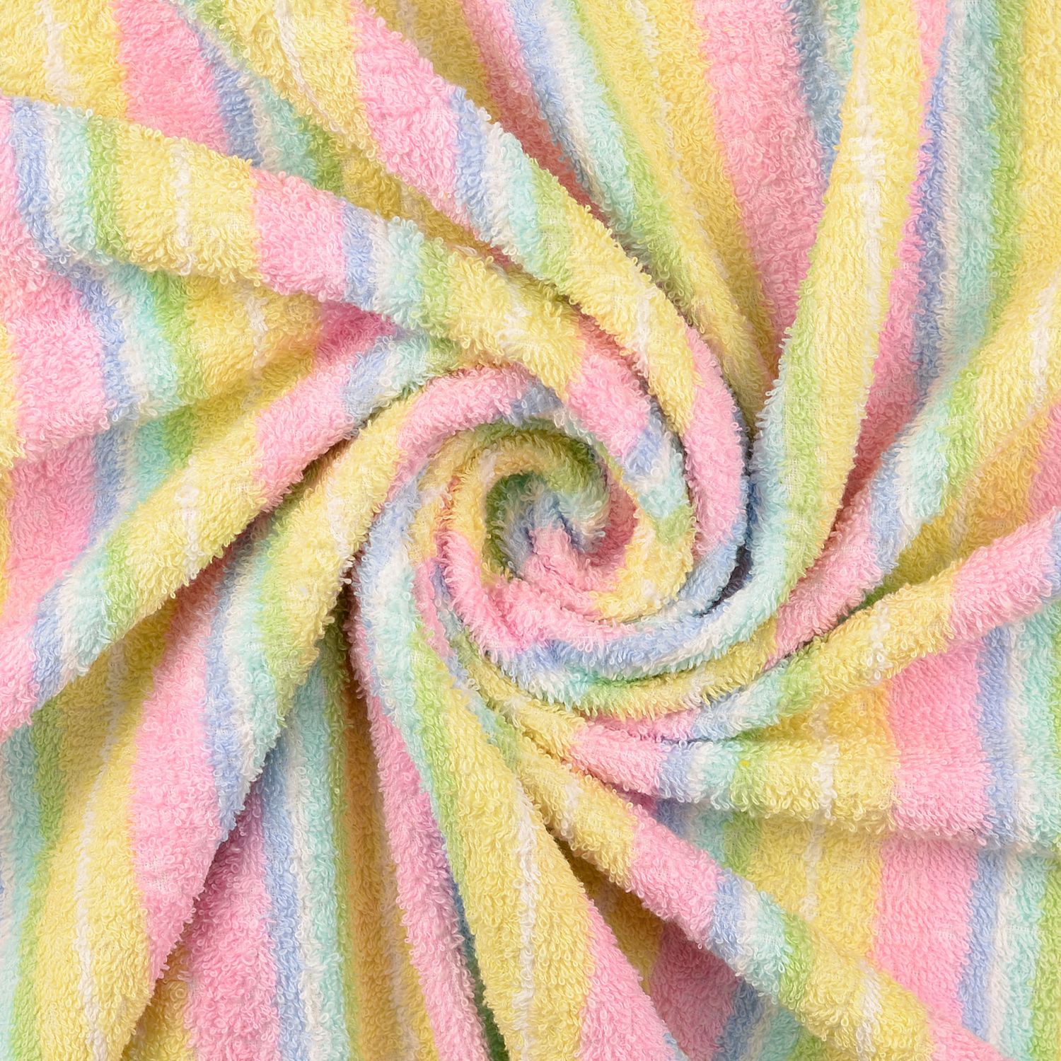 Des tons pastel doux rencontrent une éponge toute douce : ce mélange de rayures teint en fils séduit par des couleurs harmonieusement assorties. De délicates nuances de rose, menthe et bleu clair alternent avec un vanille chaud et un gris discret, créant un motif rayé joyeux mais apaisant.