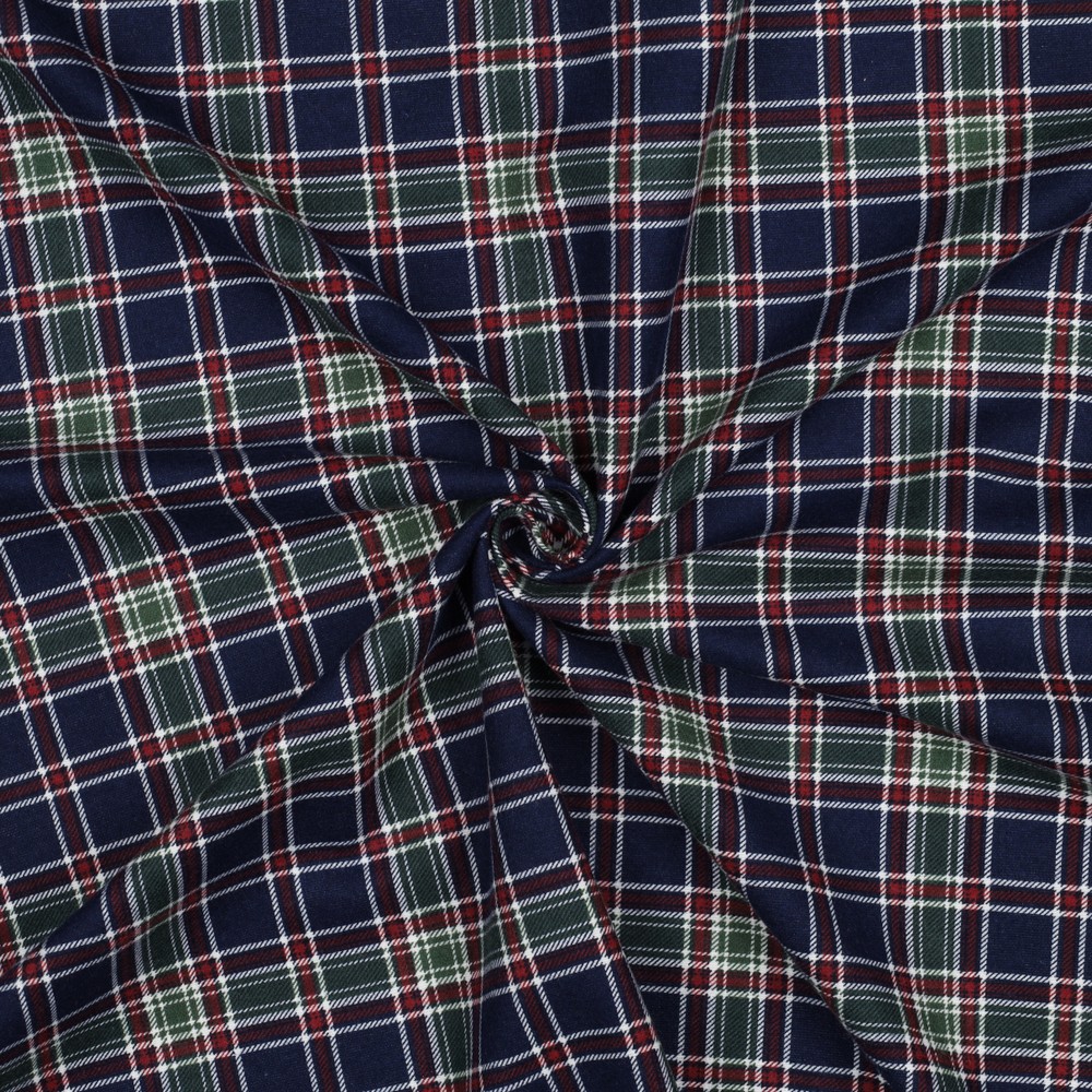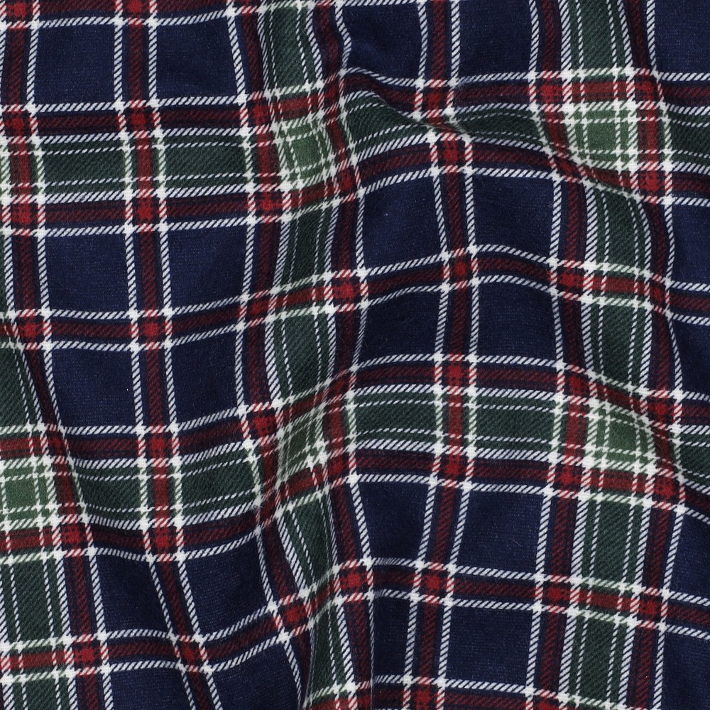 Flanelle douillette à carreaux classique : un bleu marine profond forme la base élégante, sur laquelle se dessinent de fins carreaux en blanc, rouge chaud et une touche de vert. L’harmonie de ces couleurs rappelle les motifs tartan traditionnels tout en restant intemporelle et moderne.