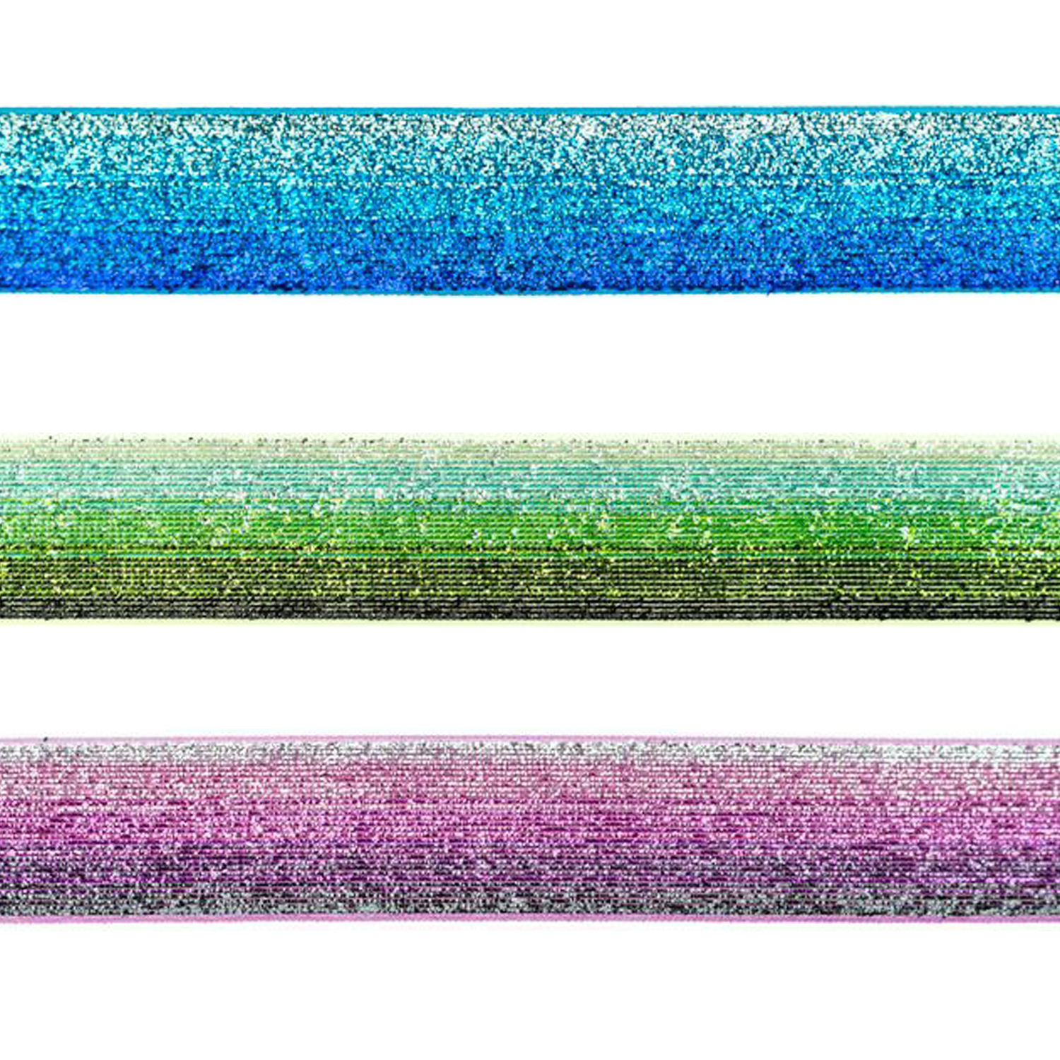 Ce ruban décoratif scintillant enchante avec son dégradé de couleurs intenses et ses reflets étincelants. Les fines particules scintillantes passent délicatement d'une teinte à l'autre - du bleu lumineux au turquoise clair, du vert frais au menthe délicat et du rose vif au rose clair. Il en résulte des jeux de couleurs nobles et vivants qui font de chaque projet de couture et de décoration un accroche-regard.