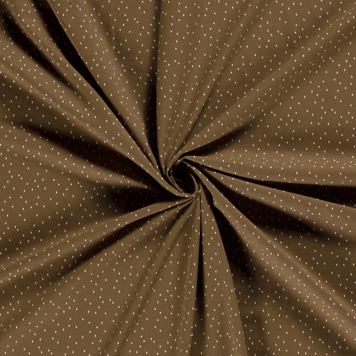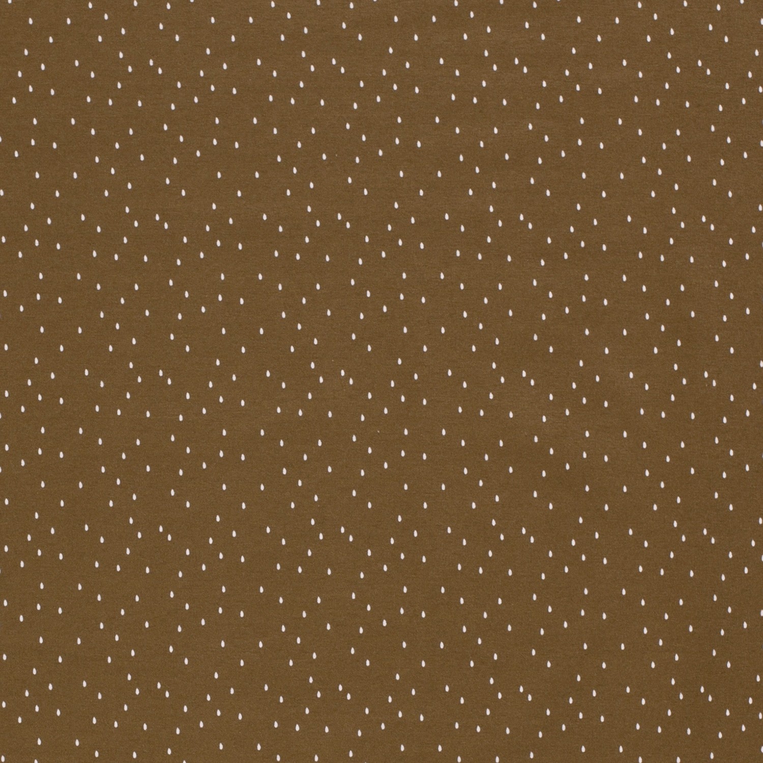 Un classique intemporel avec un détail soigné : ce jersey présente un fin motif dispersé de petits points, traits et gouttes irrégulièrement placés sur un marron chaud. Les points clairs ressemblent à de délicates éclaboussures de couleur sur du chocolat – discret, moderne et pourtant ludique.
