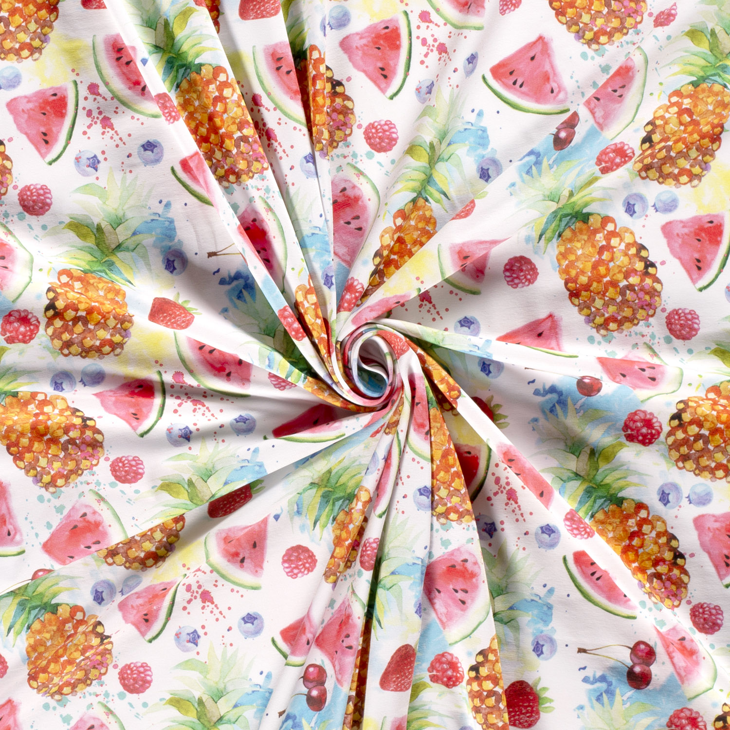Ananas juteux, fraises sucrées, cerises éclatantes, framboises, myrtilles, tranches de melon et pastèque – sur ce jersey, un panier entier de fruits s’anime dans des couleurs aquarellées joyeuses. Les dégradés délicats semblent peints à la main avec amour et ressortent particulièrement frais et estivaux sur le fond blanc éclatant.