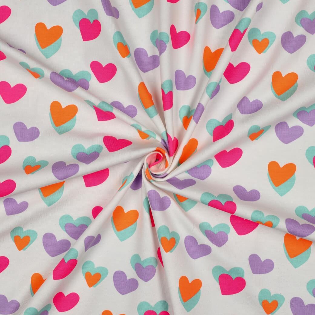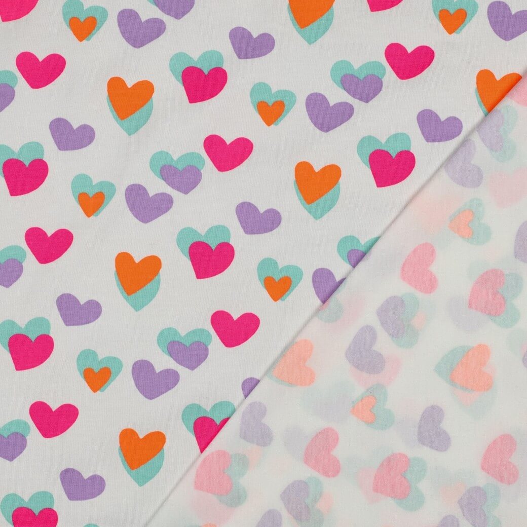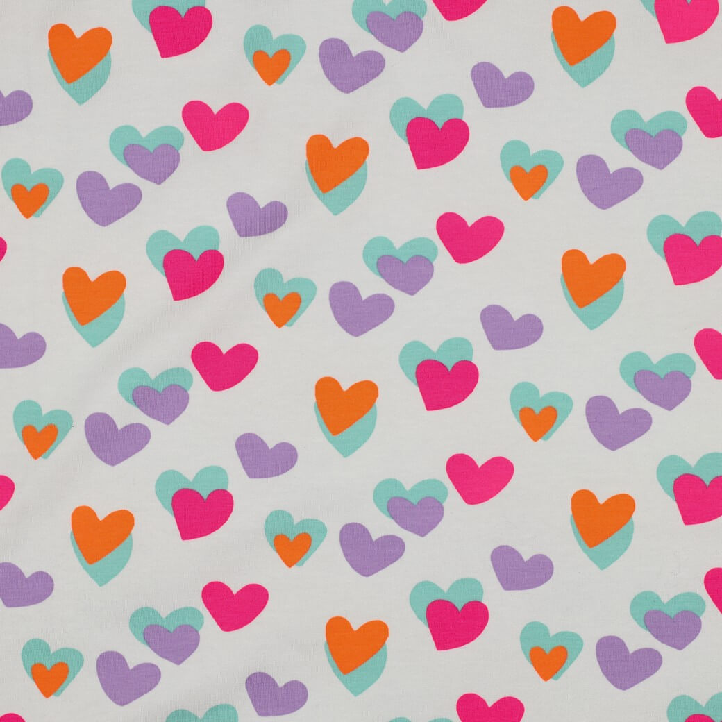 Jersey blanc éclatant parsemé de joyeux cœurs Fluo qui attirent immédiatement l'attention. Les couleurs vives sont fraîches et modernes et font briller toutes les tenues.