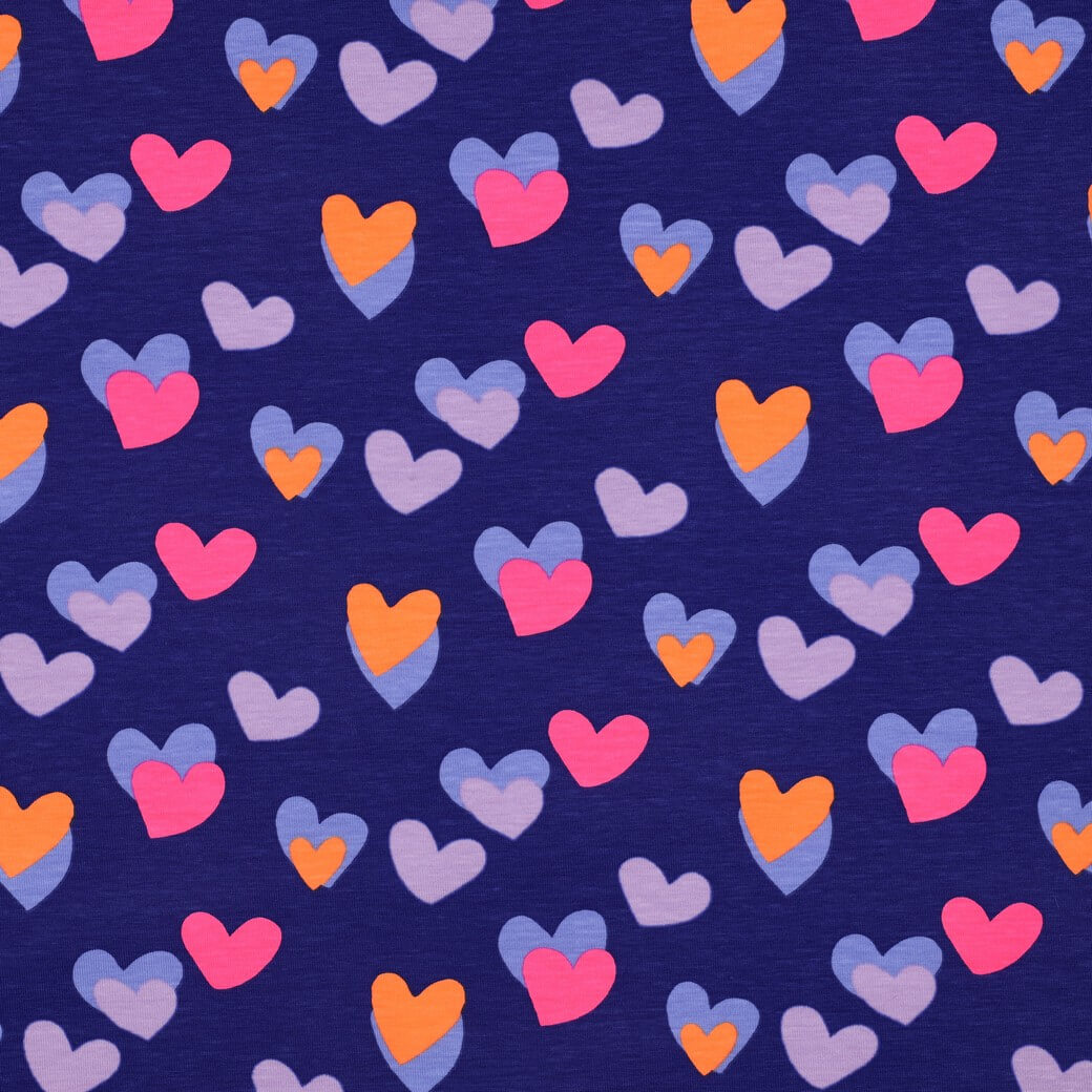Un Jersey à tomber amoureux : Sur un bleu cobalt profond, des cœurs néon brillent dans des tons vifs de rose et d'orange, créant un look joyeux et plein d'énergie. Les cœurs agissent comme de petits points lumineux sur le fond sombre et sont ainsi mis en valeur de manière particulièrement intense.