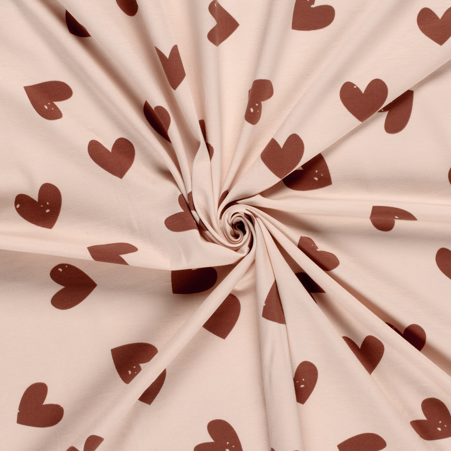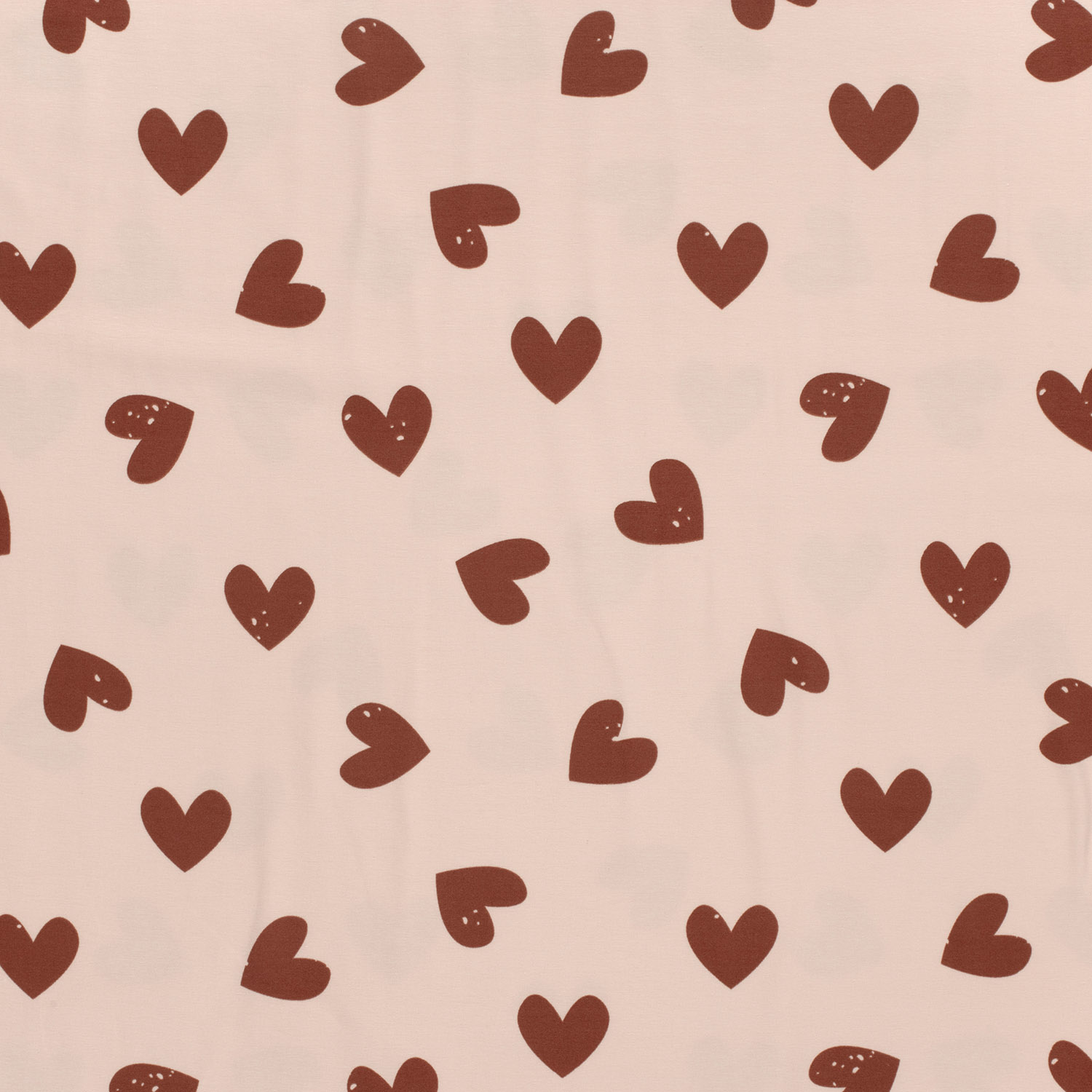 Délicat, ludique et tout simplement irrésistible : ce jersey séduit par une mer de petits cœurs dans différentes nuances de rose et de fuchsia, qui s'éparpillent sur un fond clair. Ce subtil jeu de couleurs donne un aspect chaleureux et joyeux, sans être envahissant – parfait pour tous ceux qui aiment les motifs romantiques.