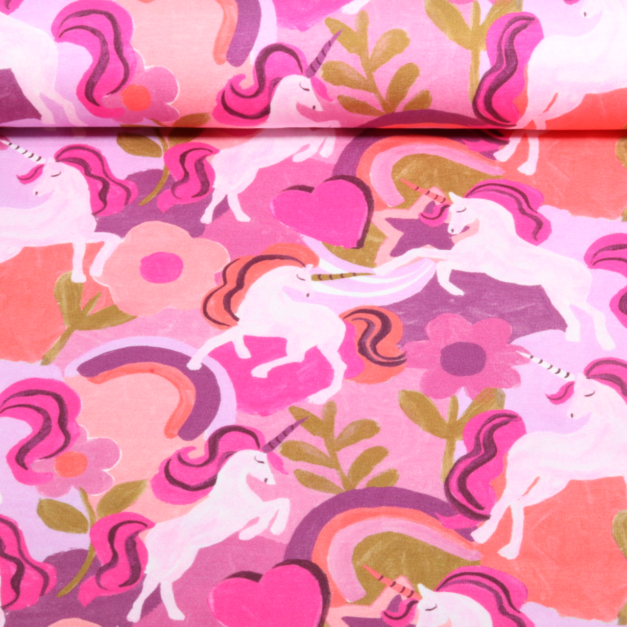 Ce jersey imprimé apporte de la couleur et de la bonne humeur à tes projets de couture grâce à ses licornes dans des tons mauves.