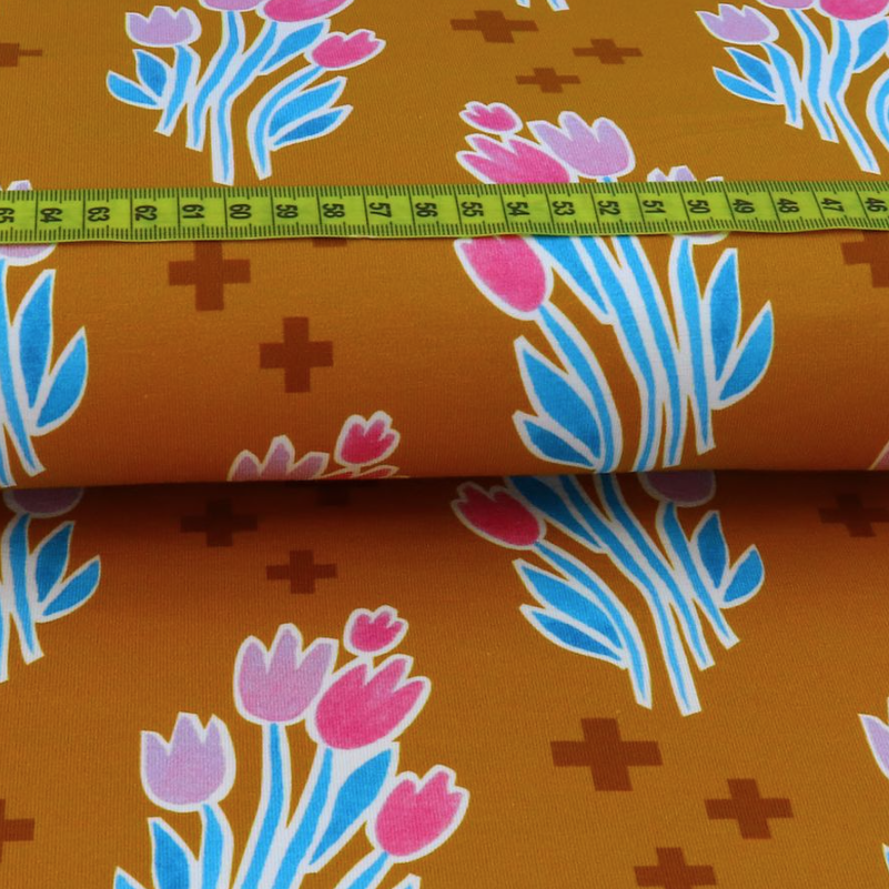 Une mer de fleurs sur un ton curry chaud : ce jersey présente un motif floral détaillé, imprimé numériquement, qui ressemble à un bouquet fraîchement cueilli dans un jardin d'été. Des fleurs délicates dans des tons roses, roses, crèmes et pastels rencontrent des feuilles fines et des petits bourgeons - vivant, joyeux et pourtant harmonieusement coordonné.