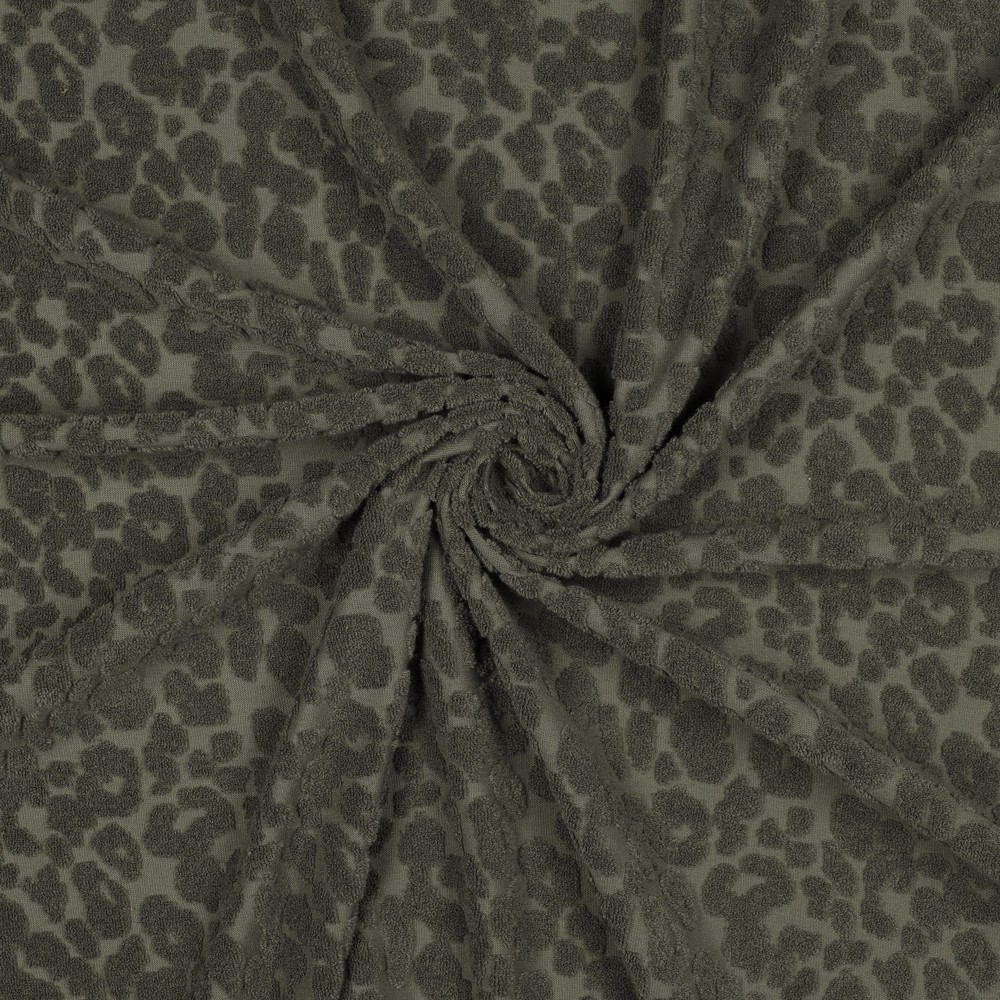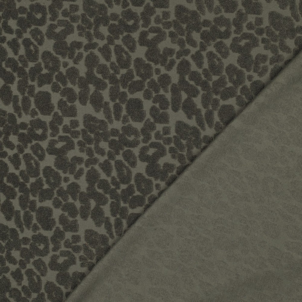 Ce jersey éponge au design léopard est un véritable accroche-regard pour tous ceux qui aiment la décontraction tout en étant à la pointe de la tendance. Le motif léopard classique se présente ici dans un vert armée moderne, combiné à des taches plus foncées et des contrastes doux - parfait pour des looks streetwear cool et des pièces confortables.