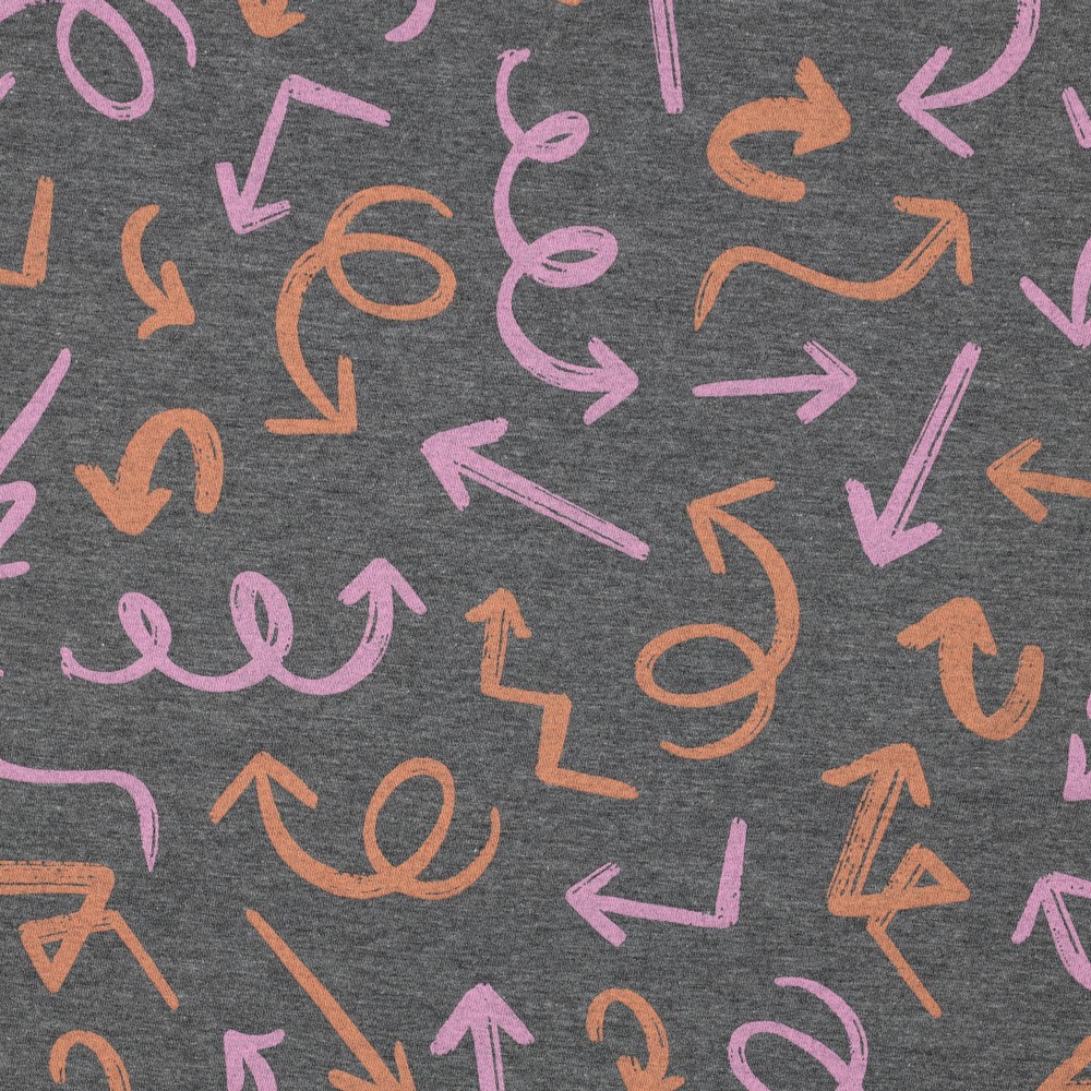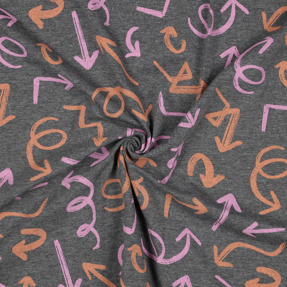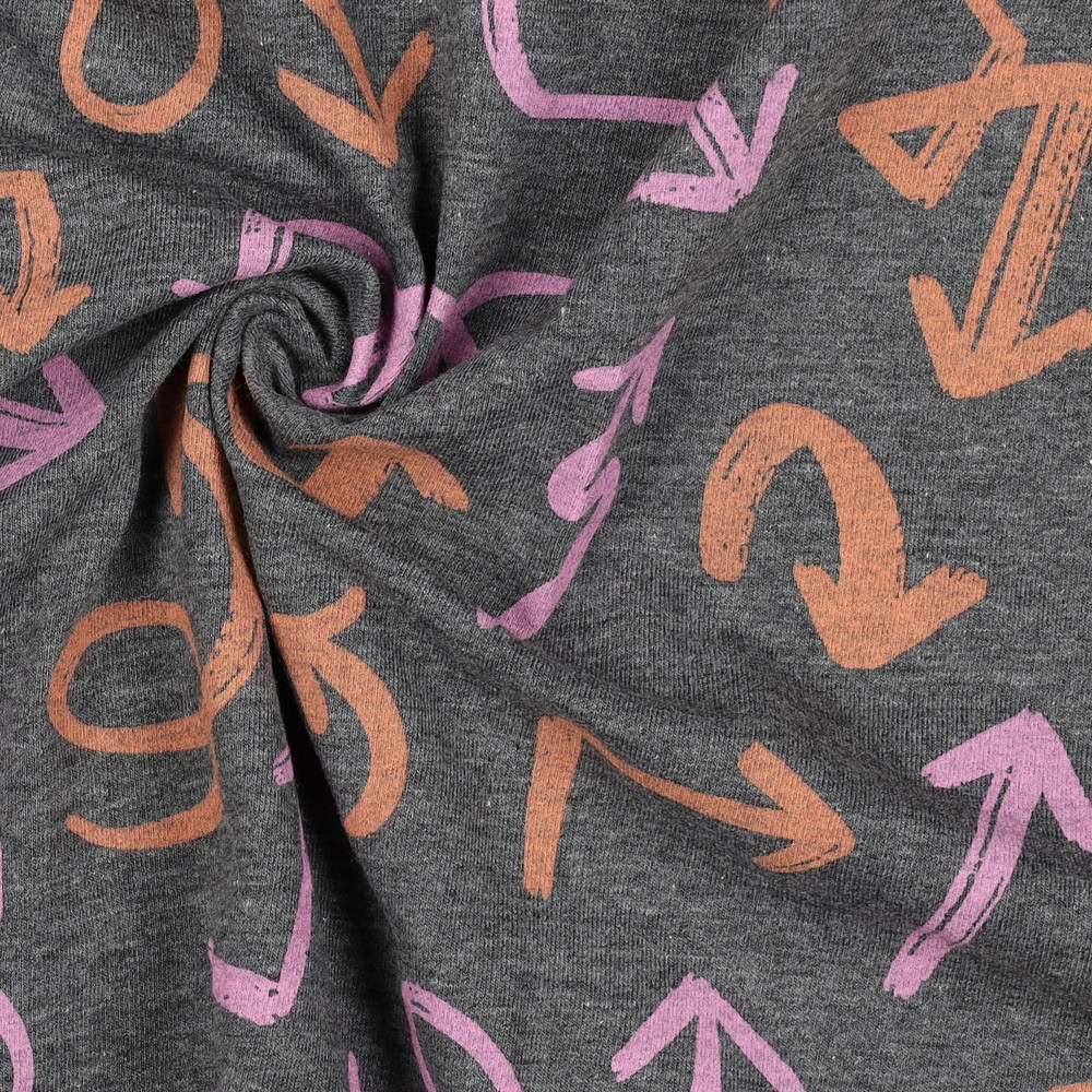 Les petites flèches disposées graphiquement apportent un look tendance, idéal pour des t-shirts, robes, leggings, pantalons bouffants, bonnets ou vêtements d’intérieur confortables. Grâce à la palette harmonieuse de gris, le tissu se combine facilement – soit avec des couleurs unies vives pour un effet accrocheur, soit ton sur ton pour un style simple d'inspiration scandinave.
