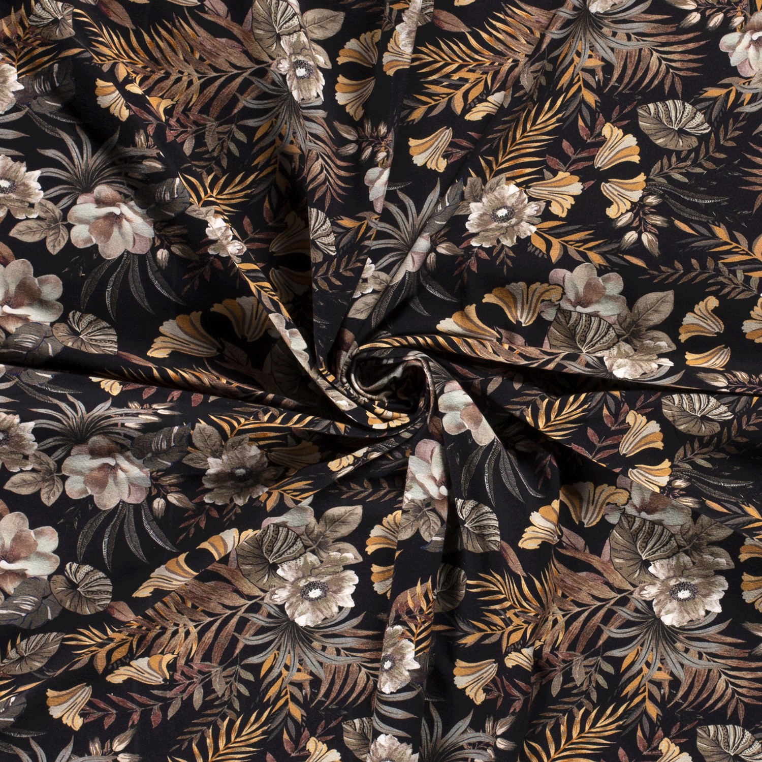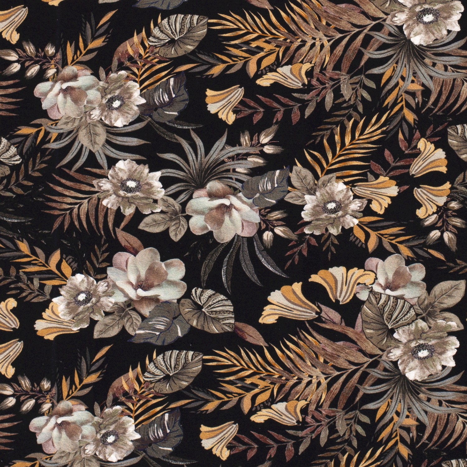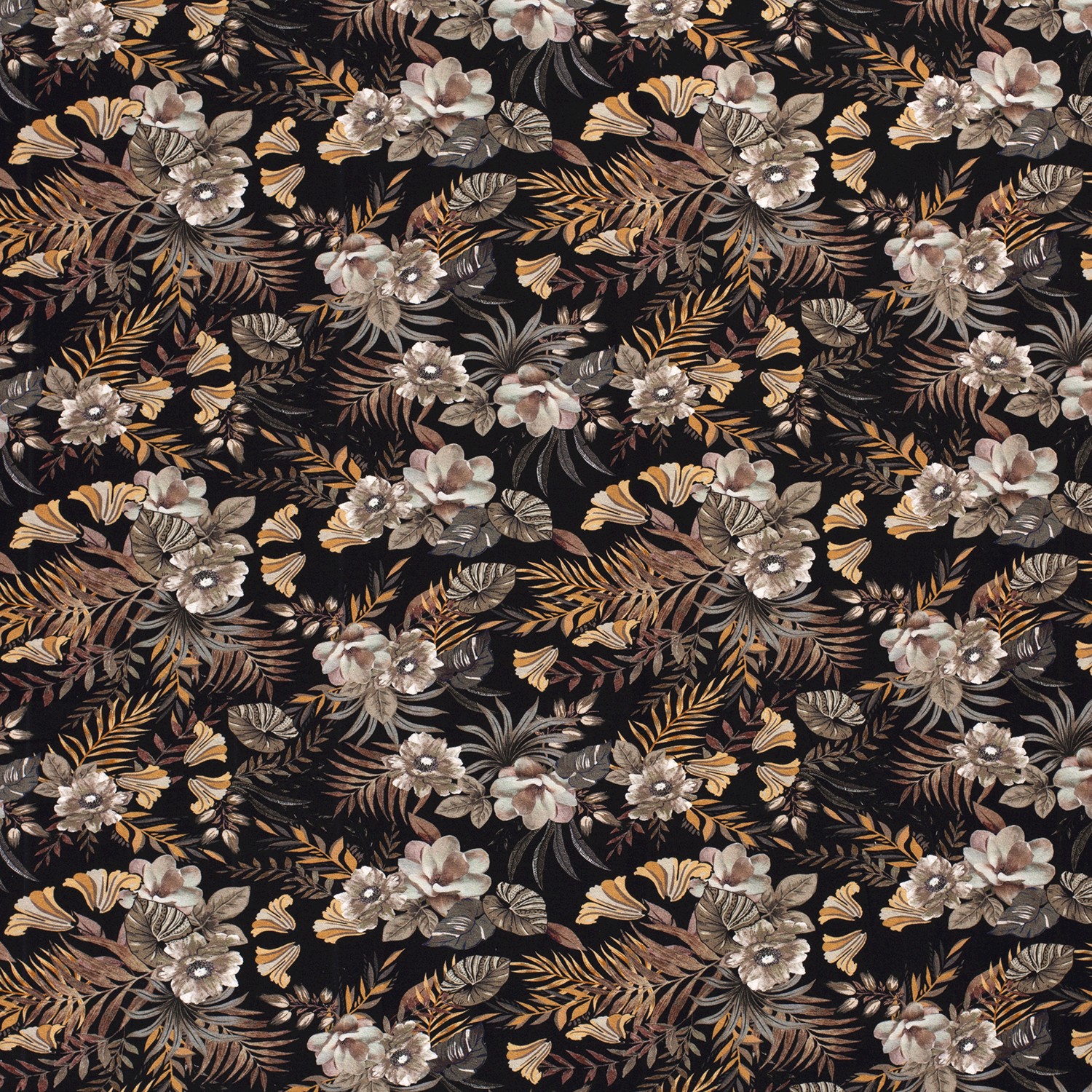 Un fond noir comme la nuit – sur lequel s'épanouit un rêve floral coloré : de luxuriantes fleurs finement dessinées en rose, fuchsia, violet et des tons délicats crème et blanc rencontrent des feuilles vertes profondes, des feuilles de fougère et de palmier. Les motifs floraux semblent presque peints et ressortent particulièrement intensément sur le fond sombre.