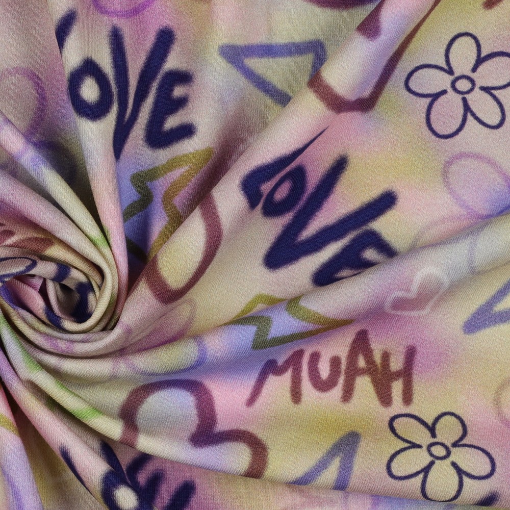 Ce jersey apporte une véritable sensation streetstyle à vos projets de couture : un rose vif rencontre des éléments graffiti cool, des lignes dynamiques et des contrastes forts. L'impression urbaine ressemble à un mur fraîchement tagué et fait de chaque pièce un véritable accroche-regard.