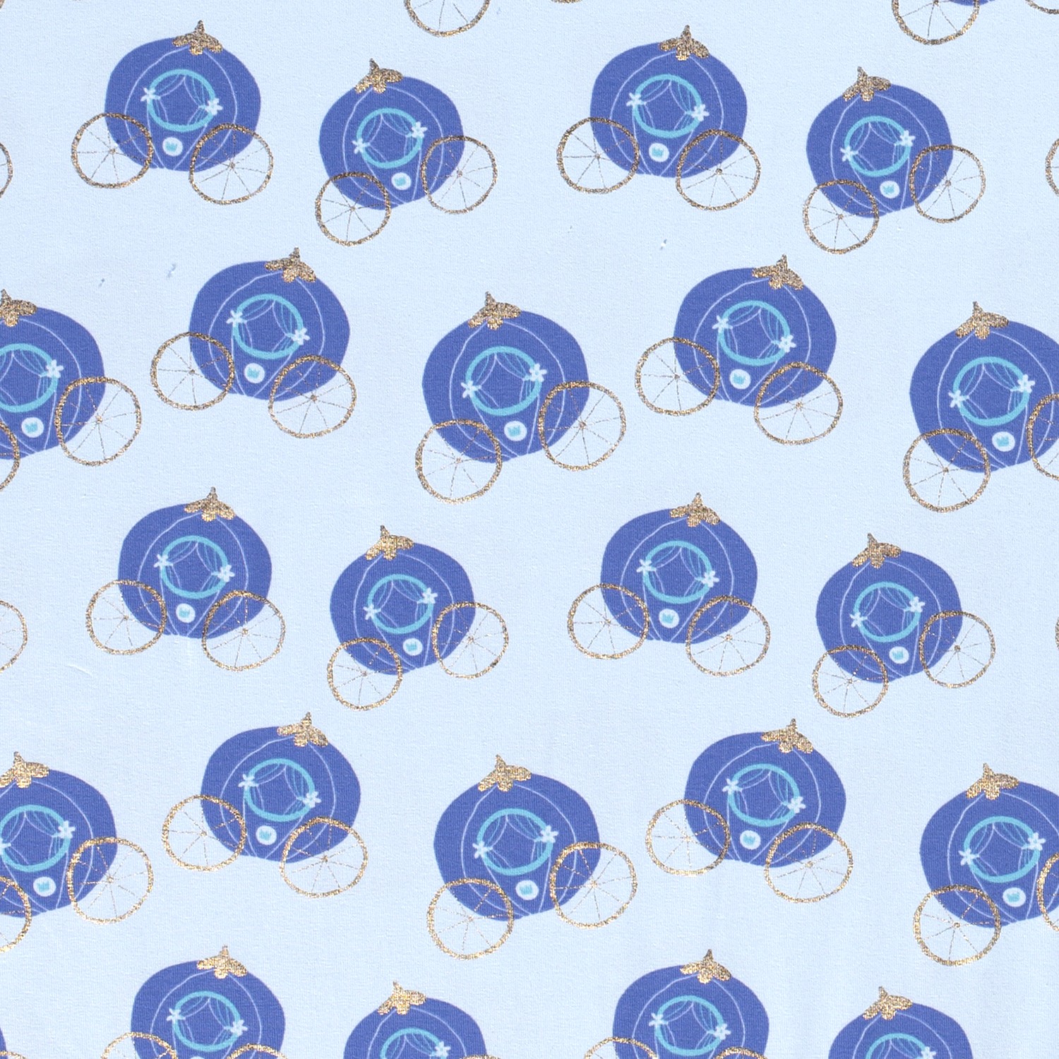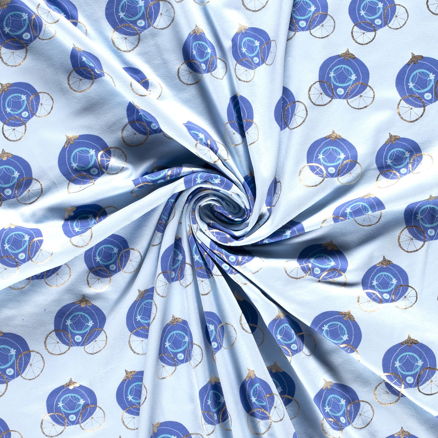 Un tissu digne d'un conte de fées : sur un fond bleu clair délicat, de nobles carrosses dorés circulent. L'impression en feuille de haute qualité scintille selon l'angle de la lumière et confère au design une allure élégante, presque royale – parfait pour les petites et grandes princesses.