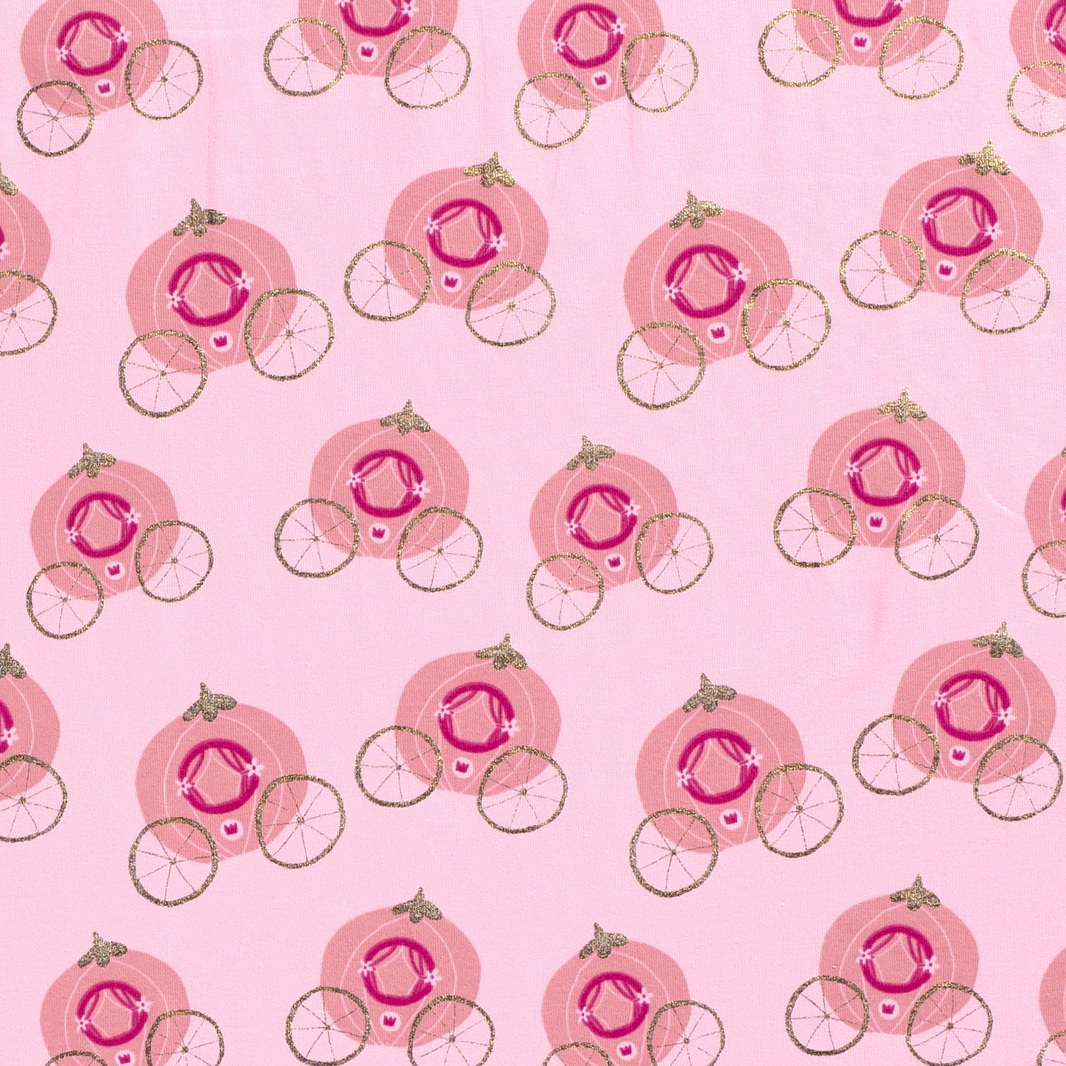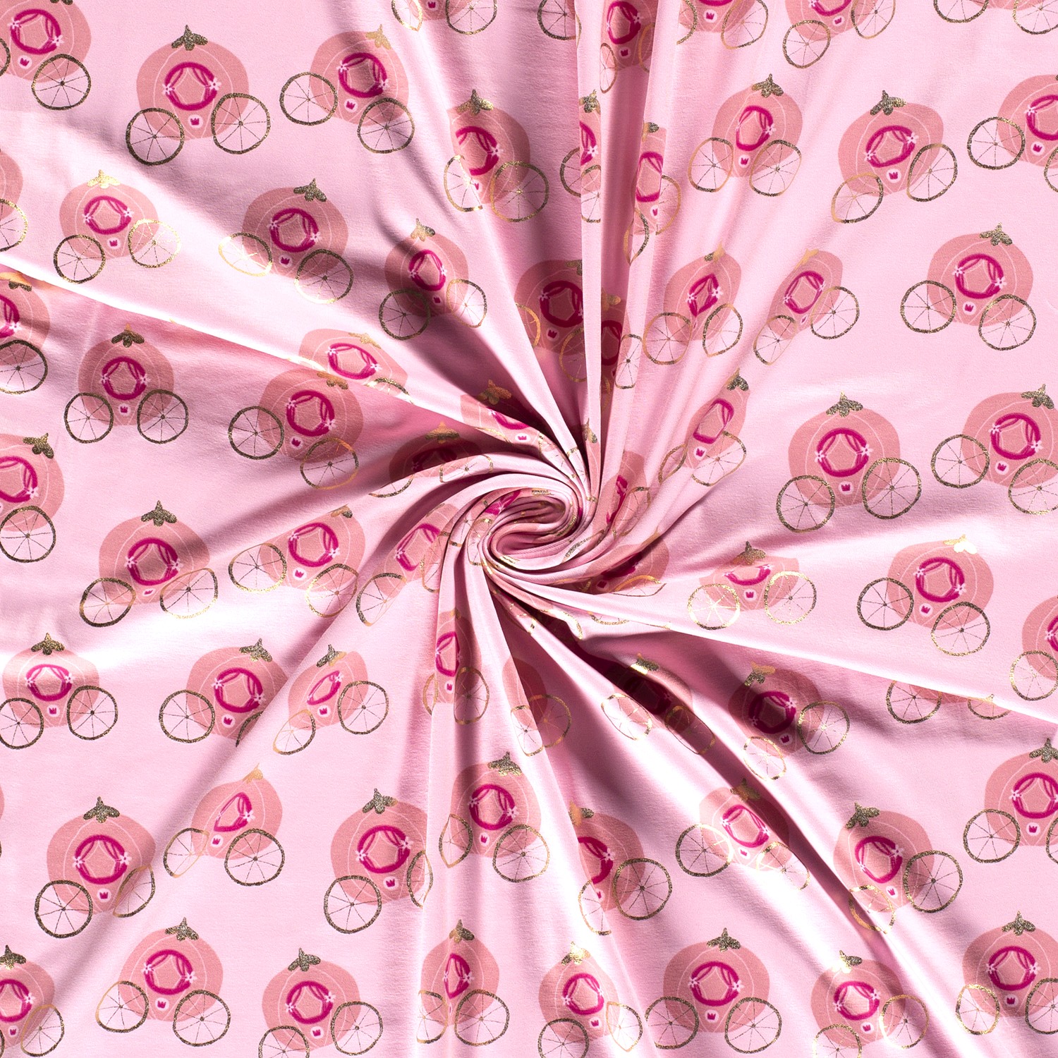 Un rêve en rose et or : ce jersey enchanteur séduit avec un fond délicatement rose sur lequel des carrosses dorés élégants brillent comme dans un conte de fées. L'impression foil noble scintille selon la lumière et confère au tissu un look luxueux et festif – parfait pour les petites et grandes princesses.