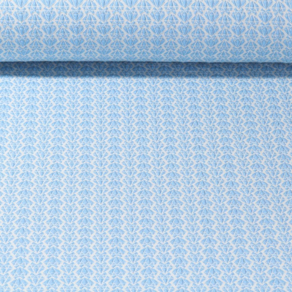 Un bleu clair délicat rencontre un design de diamant étincelant : ce jersey jacquard exclusif ajoute une touche de glamour à tout projet de couture. Les motifs en losange tissés rappellent de petites pierres précieuses stylisées qui se répartissent uniformément sur le tissu et lui confèrent une structure noble et moderne.