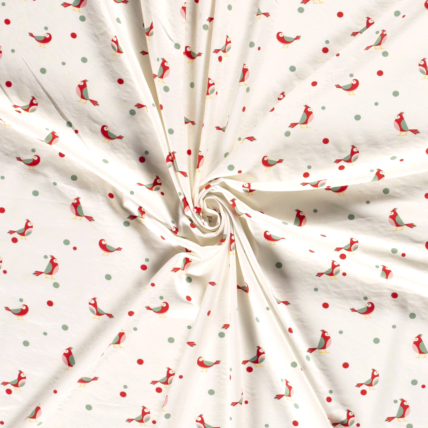 Une touche d'ambiance tropicale sur un doux crème : sur ce jersey, des perroquets colorés s'animent parmi des feuilles de palmier luxuriantes et de délicates fleurs. De petits points apportent des accents ludiques et rendent le design vivant et joyeux – parfait pour ceux qui aiment les motifs colorés, joyeux et un peu exotiques.