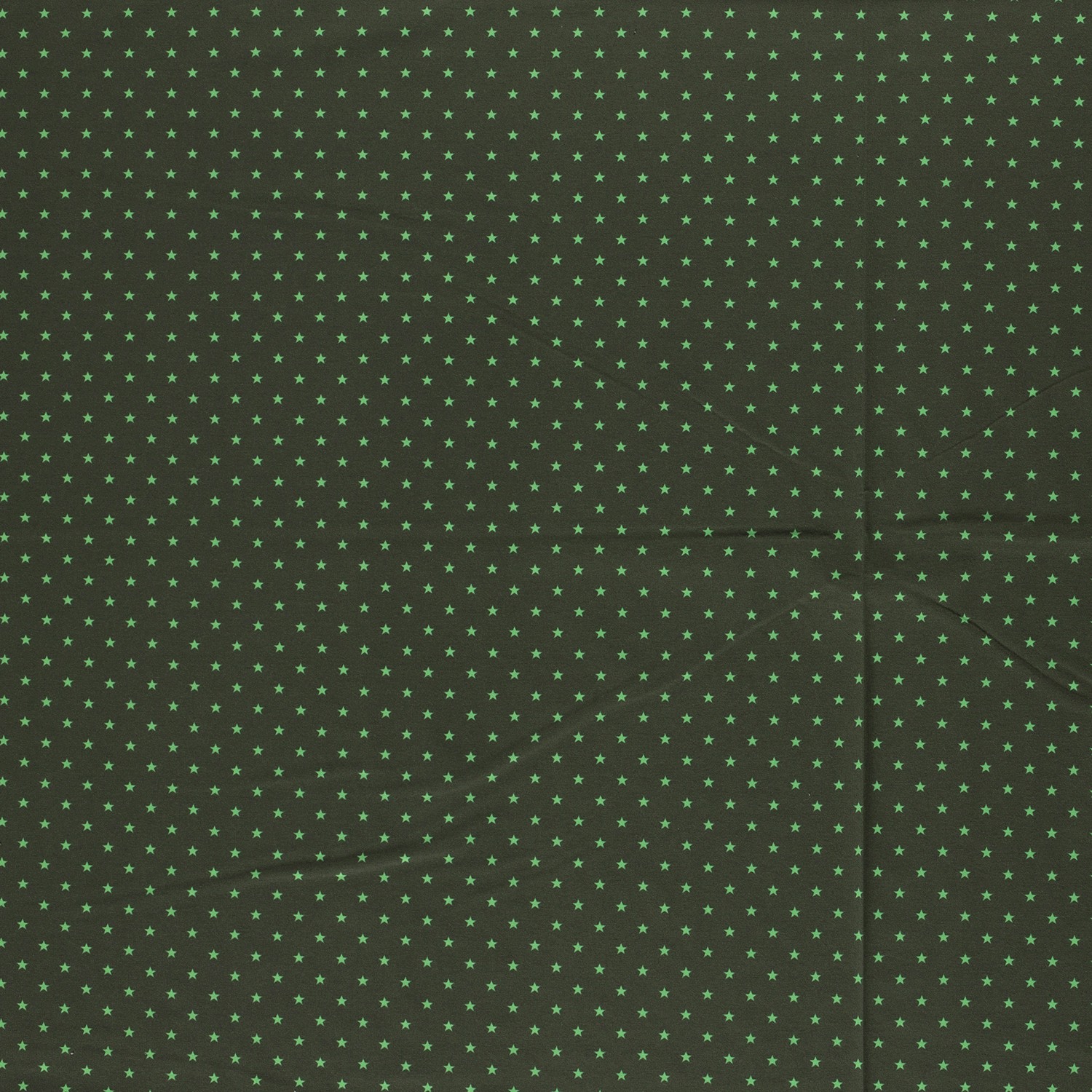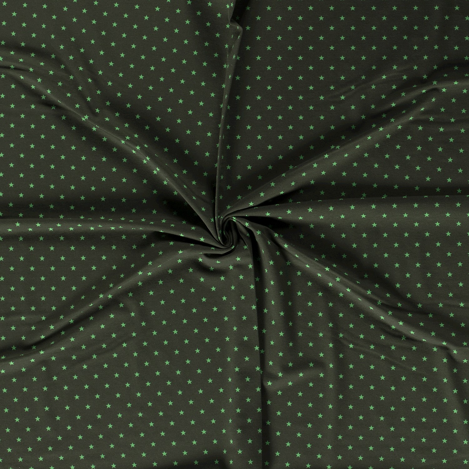 Un ton vert foncé profond et élégant sert de toile de fond à ce jersey pour une mer d'étoiles magique : de minuscules étoiles uniformément réparties en blanc éclatant scintillent comme de petites lumières sur le tissu. Le motif discret de mini étoiles est ludique sans être envahissant – parfait pour ceux qui aiment les étoiles mais préfèrent un design calme et élégant.