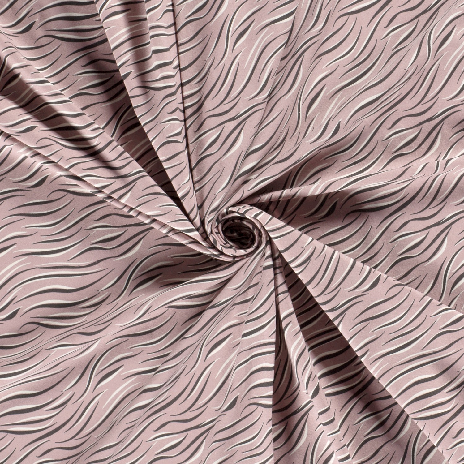 Ce jersey apporte un look sauvage tout en douceur à vos projets de couture : sur un délicat vieux rose, des lignes zébrées irrégulières allant du gris foncé au noir parcourent le tissu, créant un imprimé animalier moderne – élégant, mais pas trop voyant. Les rayures ondulées semblent peintes au pinceau, donnant au design un aspect vivant et en même temps très harmonieux.