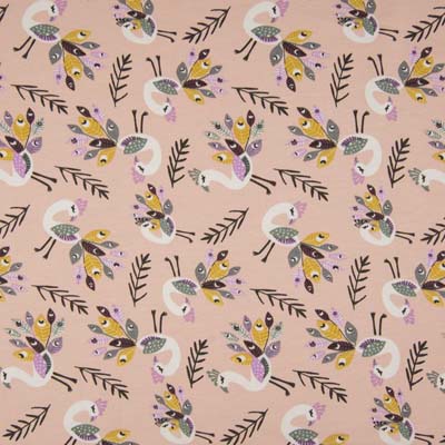 Une touche d'élégance pour vos projets de couture : Sur un délicat rose ancien, de gracieux paons déploient leur somptueux plumage. Des plumes fines, des ornements ludiques et des couleurs harmonieusement assorties confèrent à ce jersey une allure noble, légèrement romantique.
