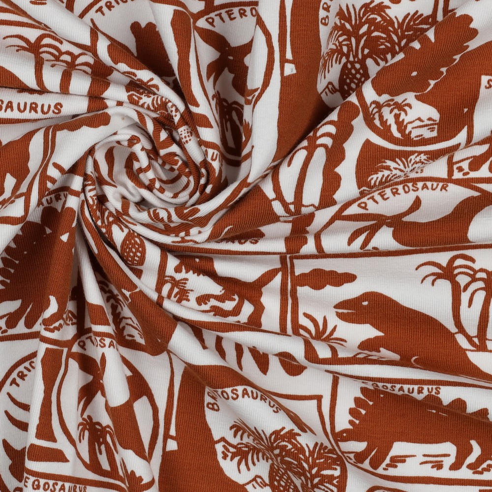 Ce jersey fait briller les petits fans de dinosaures ! Sur un fond clair et blanc, se trouvent des dinosaures soigneusement dessinés dans des tons chauds de marron et beige, encadrés comme de petites patches ou écussons. Les détails ludiques et les contrastes de couleurs douces donnent au design un look moderne mais adapté aux enfants.