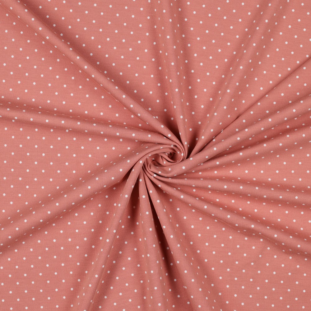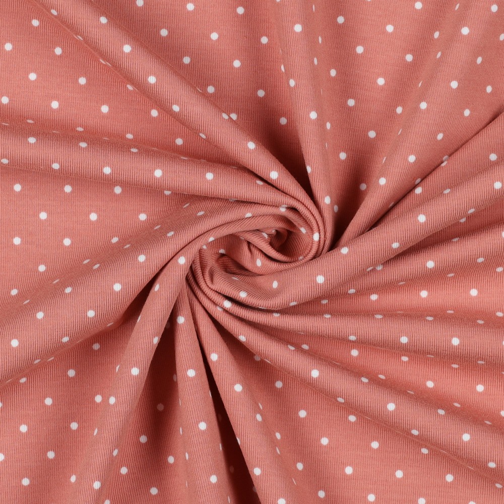 Délicat, ludique et pourtant merveilleusement intemporel – ce jersey vieux rose à pois blancs apporte une touche romantique à tous vos projets de couture. La teinte rose douce est chaleureuse et féminine, tandis que les petits pois blancs uniformément répartis donnent un aspect joyeux et léger.