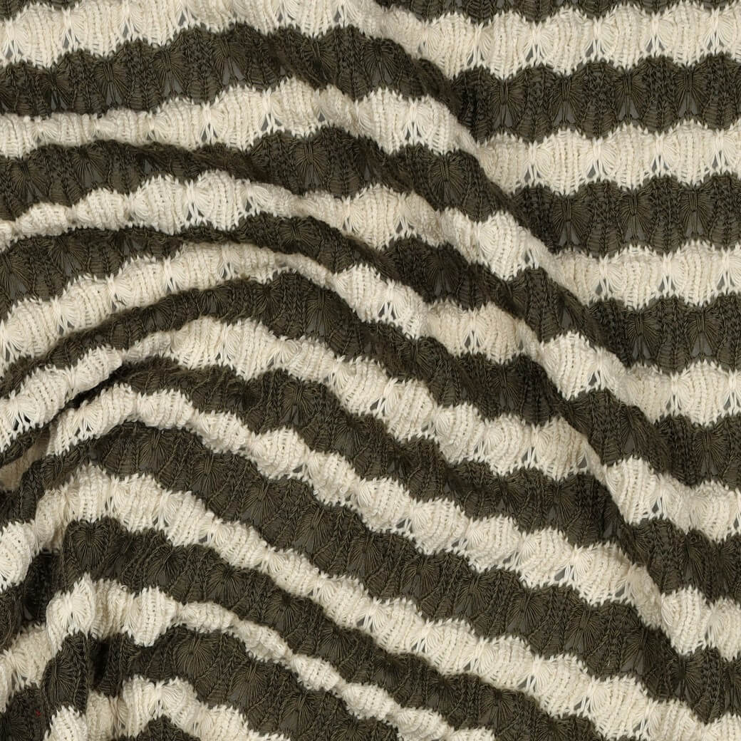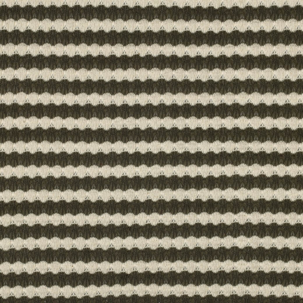 Ce noble jersey tricoté séduit par son motif rayé jacquard en olive chaud et en écru doux. Les rayures longitudinales harmonieuses confèrent au tissu un aspect intemporel et moderne, à la fois décontracté et élégant.