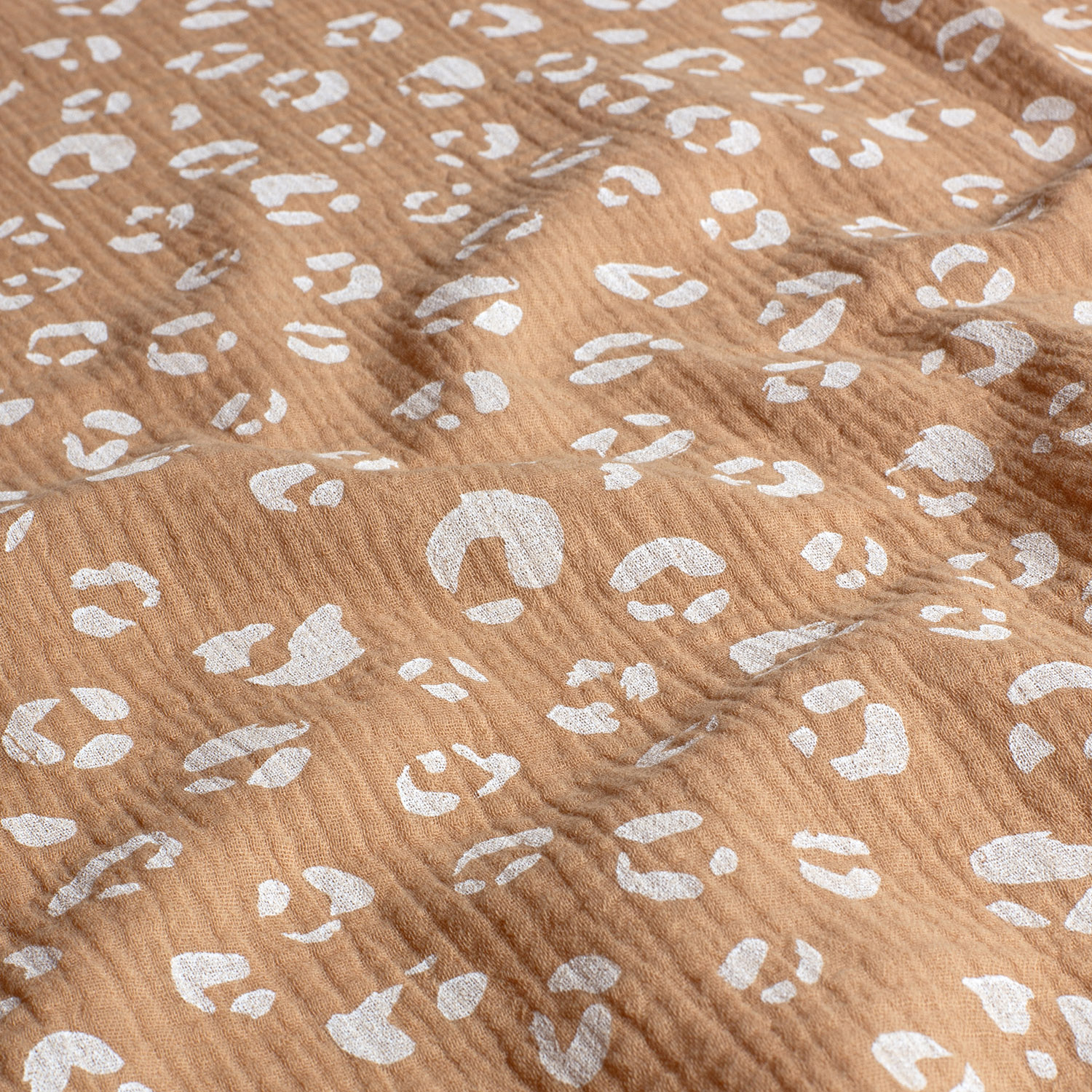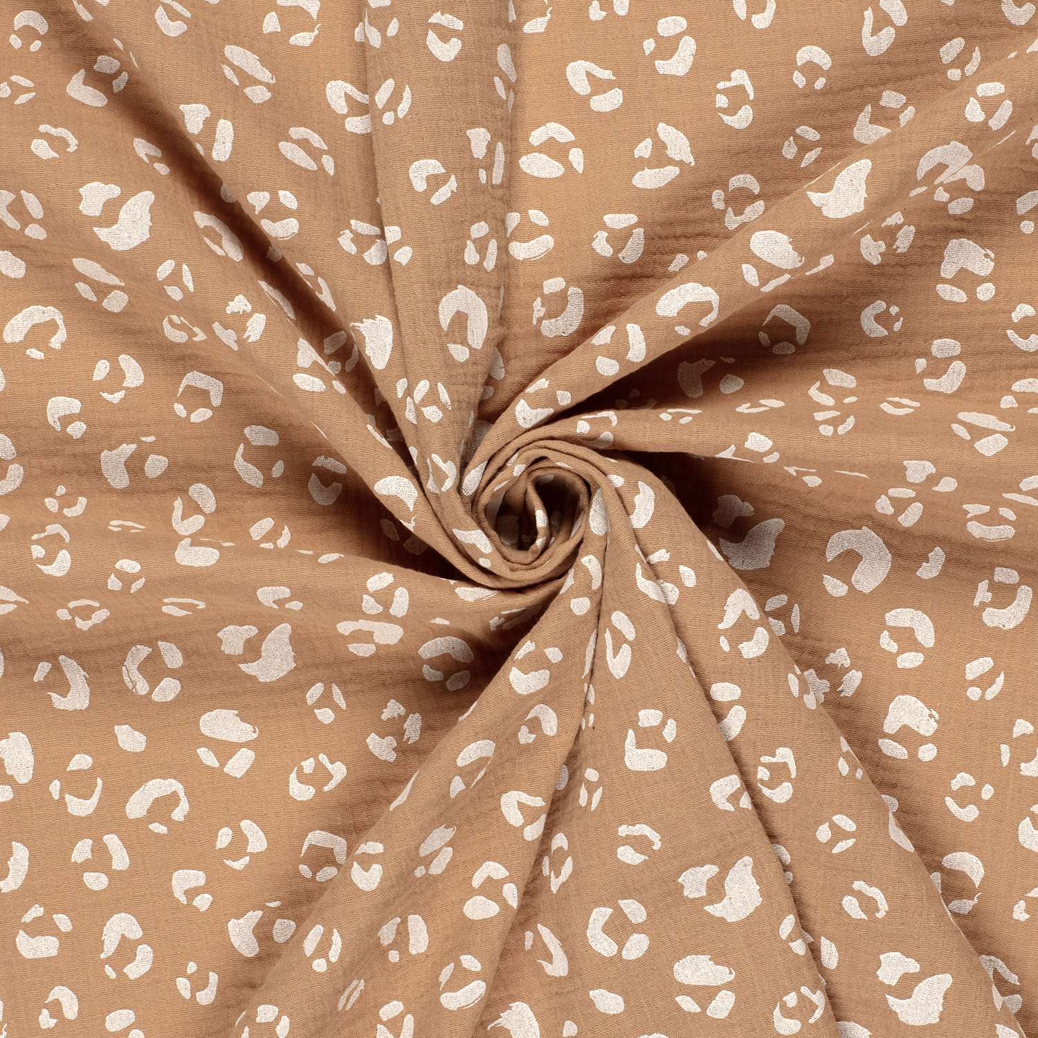 Que ce soit pour des blouses décontractées, des foulards aériens, des écharpes légères, des vêtements pour enfants ou des couvertures douillettes – le motif léopard discret fait de chaque projet de couture un élément remarquable sans être envahissant. Le tissu s’harmonise parfaitement avec des tons naturels comme le crème, le beige et le marron, mais se marie aussi très bien avec des couleurs vives pour des contrastes intéressants.