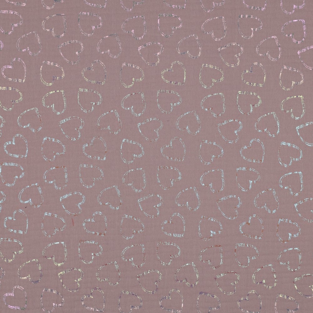 Une mousseline délicate dans un magnifique rose ancien, ornée de cœurs arc-en-ciel scintillants – ce tissu est fait pour tous ceux qui aiment l’exceptionnel. Les petits cœurs brillants en impression foil arc-en-ciel apportent des touches élégantes et scintillent subtilement selon la lumière sur le fond doux.