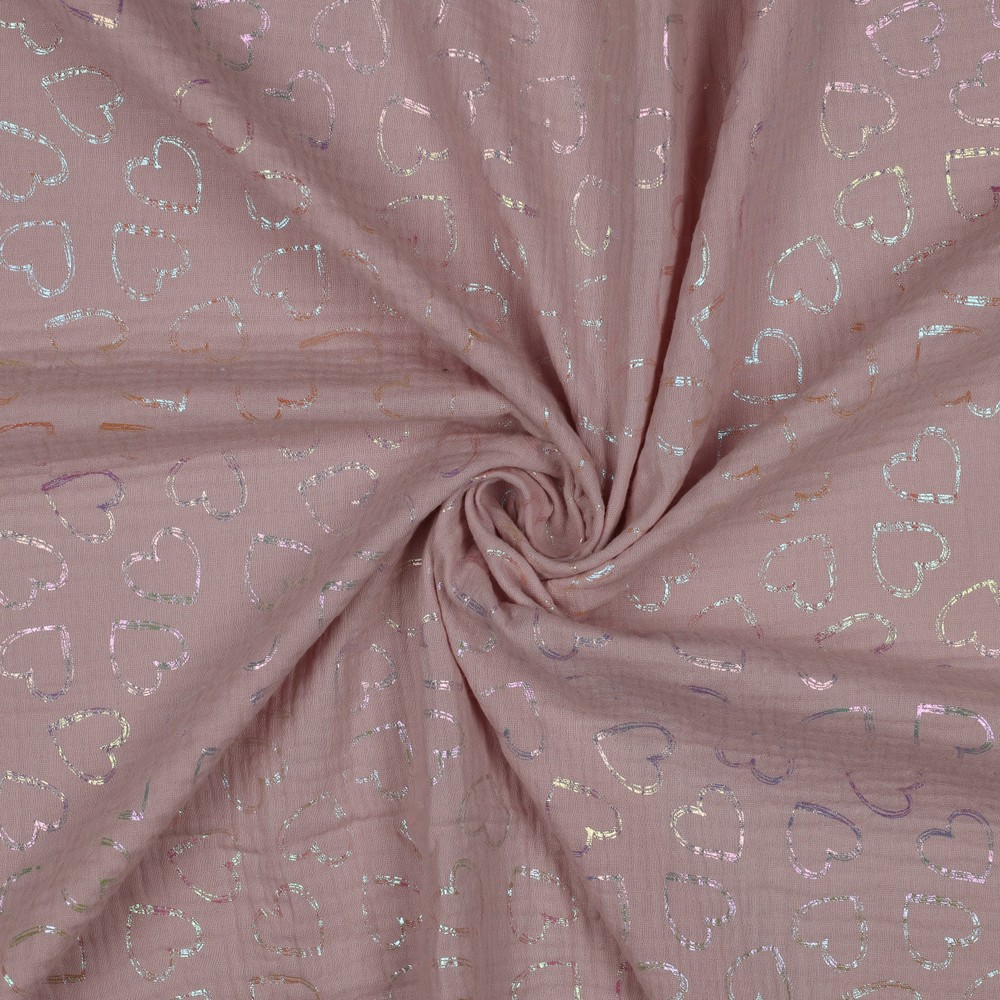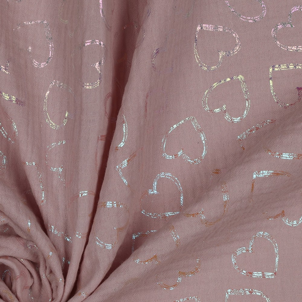 Mousseline de Coton - Cœurs Arc-en-ciel Impression Foil Rose Ancien