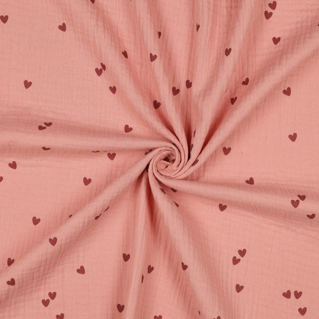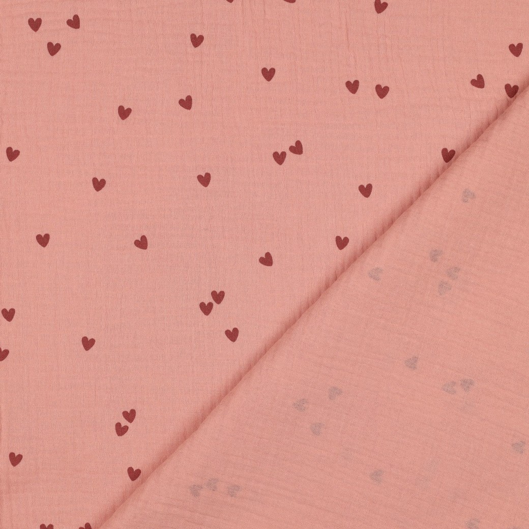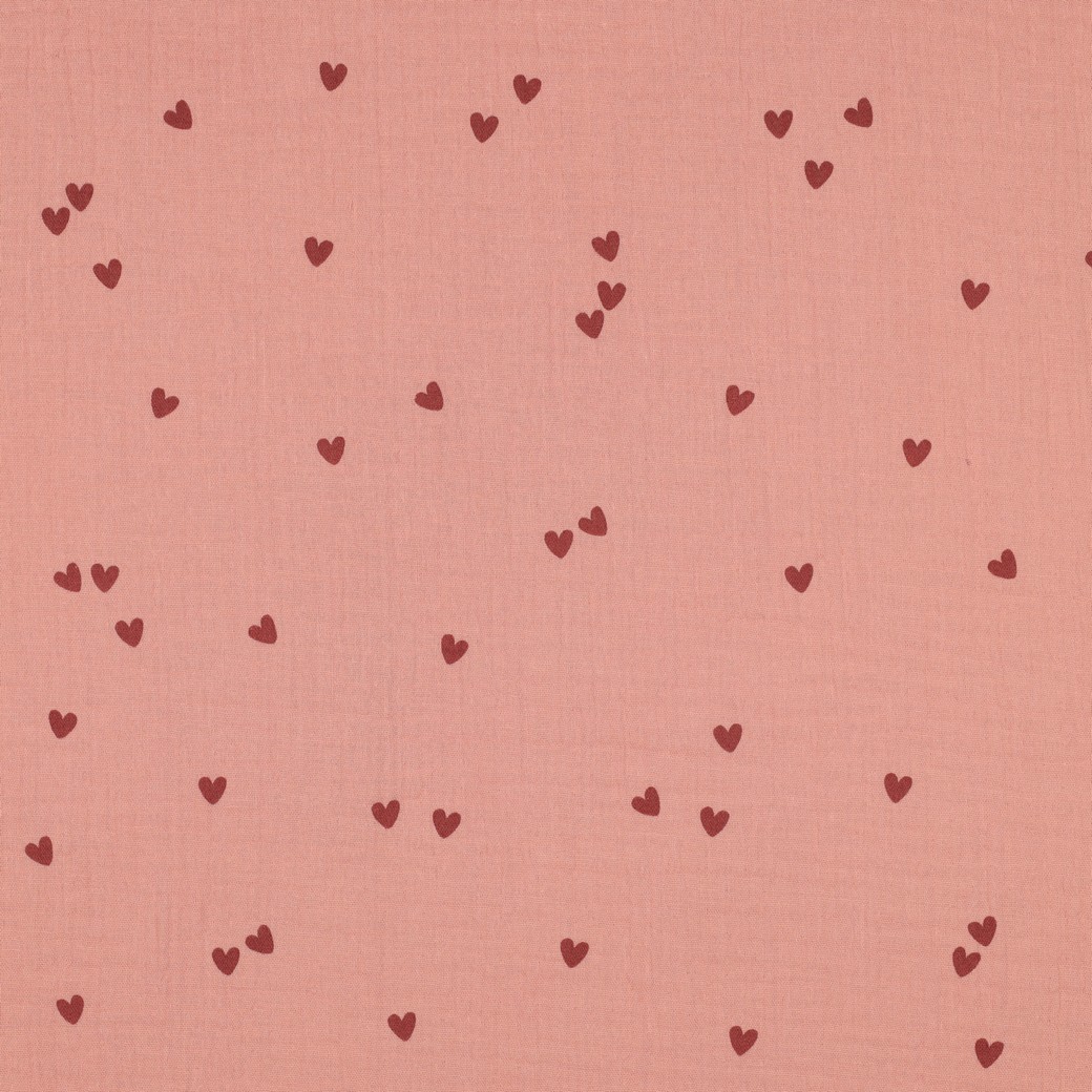 Tendre, ludique et à tomber amoureux : cette mousseline rose foncé est parsemée de petits cœurs clairs. Le tissu légèrement structuré est merveilleusement doux et aéré et donne à chaque projet de couture une touche à la fois romantique et moderne.