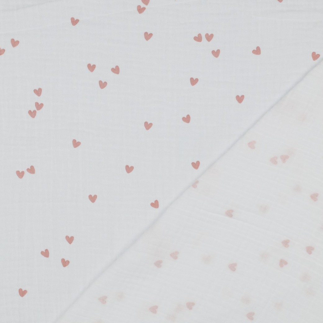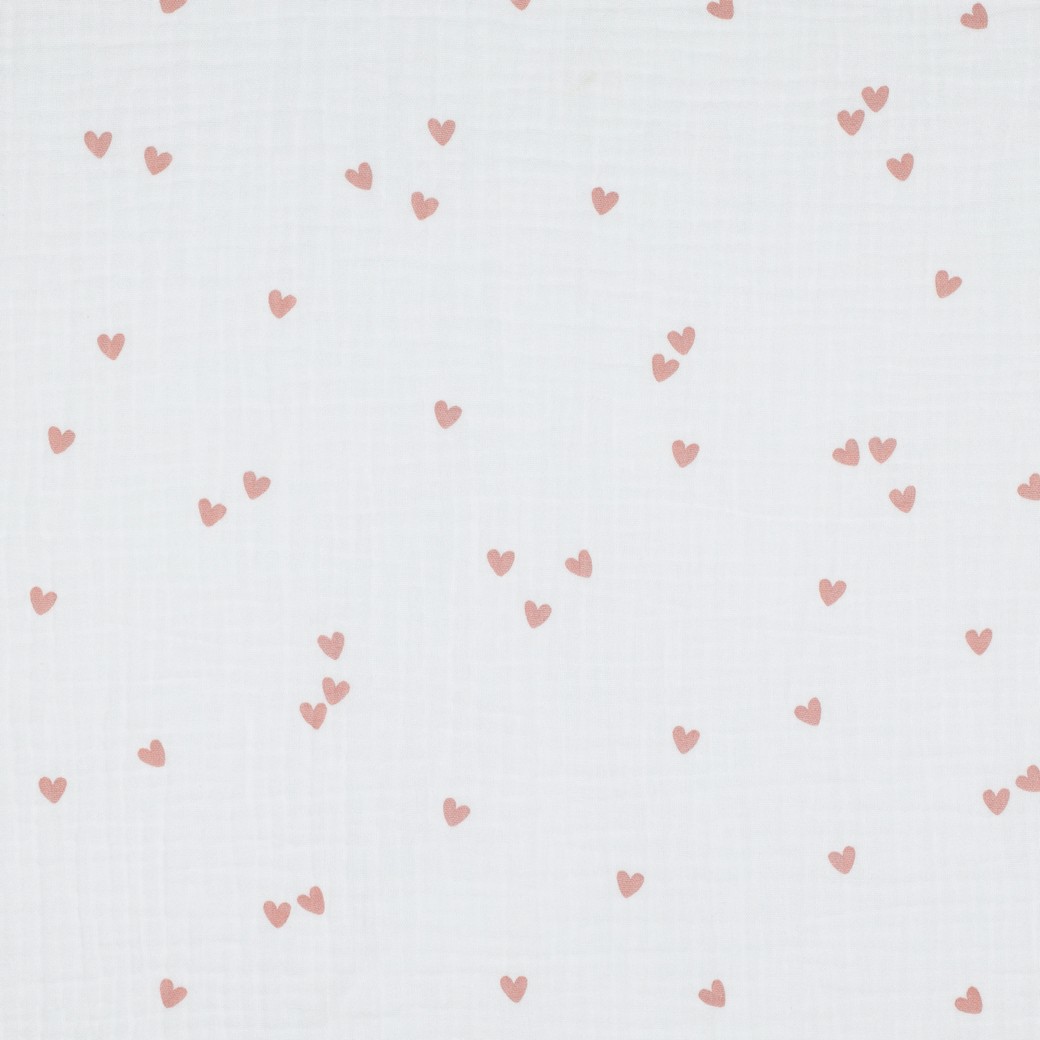 Tendre, aéré et tout simplement à tomber amoureux : Cette mousseline enchante avec un délicat motif de dispersion de petits cœurs répartis uniformément. Les petits cœurs blancs se détachent délicatement de l'arrière-plan et confèrent au tissu un aspect ludique, mais néanmoins simple et intemporel.